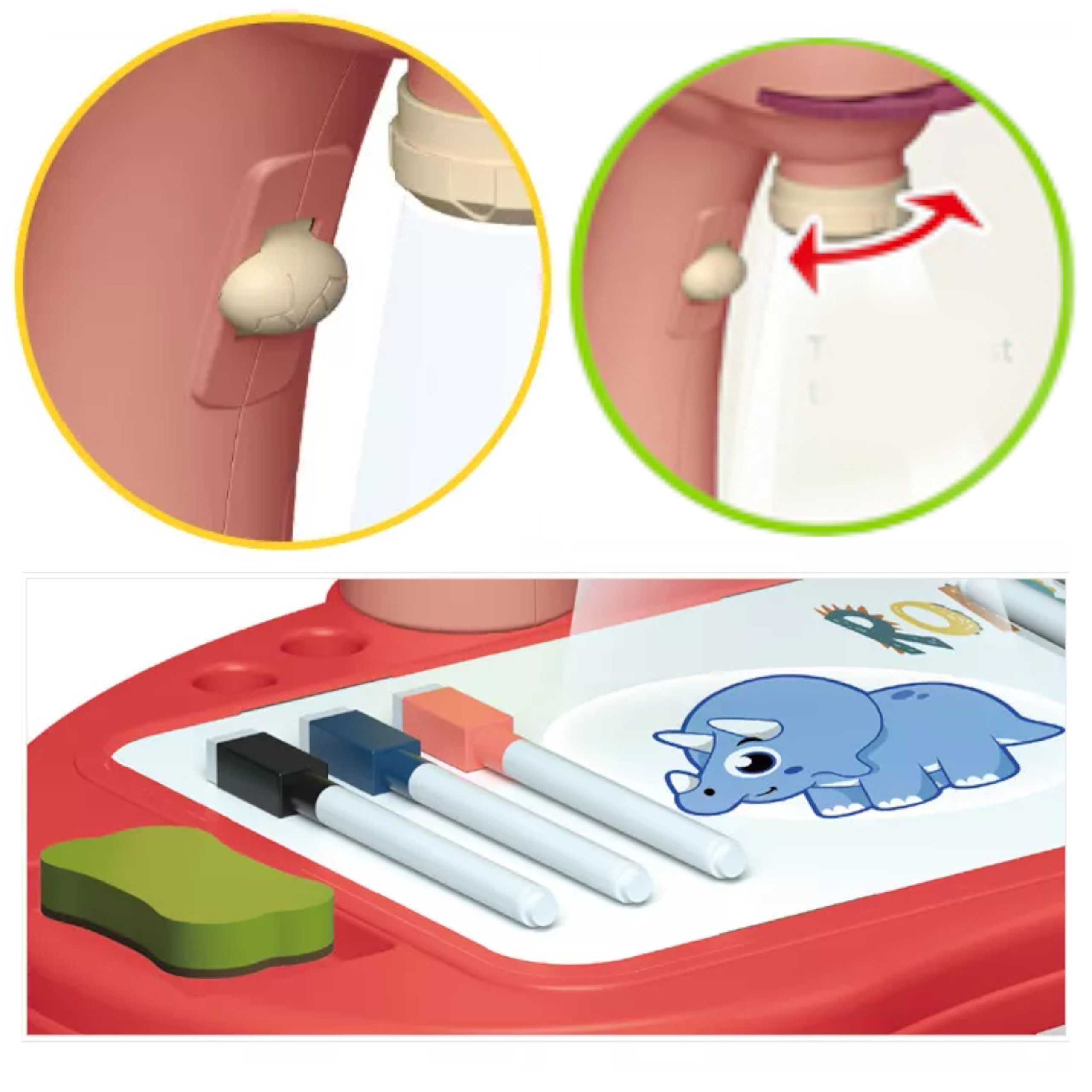 - Na szyi dinozaura znajduje się przełącznik. Jeśli przełącznik ustawiony jest na najwyższym polu, projektor jest wyłączony. Oczko niżej włączamy lampkę dzięki której możemy rysować z krążków wybrane wzory. Najniższa pozycja pozwala nam rysować ciesząc się wesołą, skoczną melodyjką. Dzięki temu można malować z muzyką albo bez. Projektor gra 1 melodyjkę w kółko. Główka jest ruchoma (góra-dół), natomiast całe ramie można przesuwać w lewo i prawo.