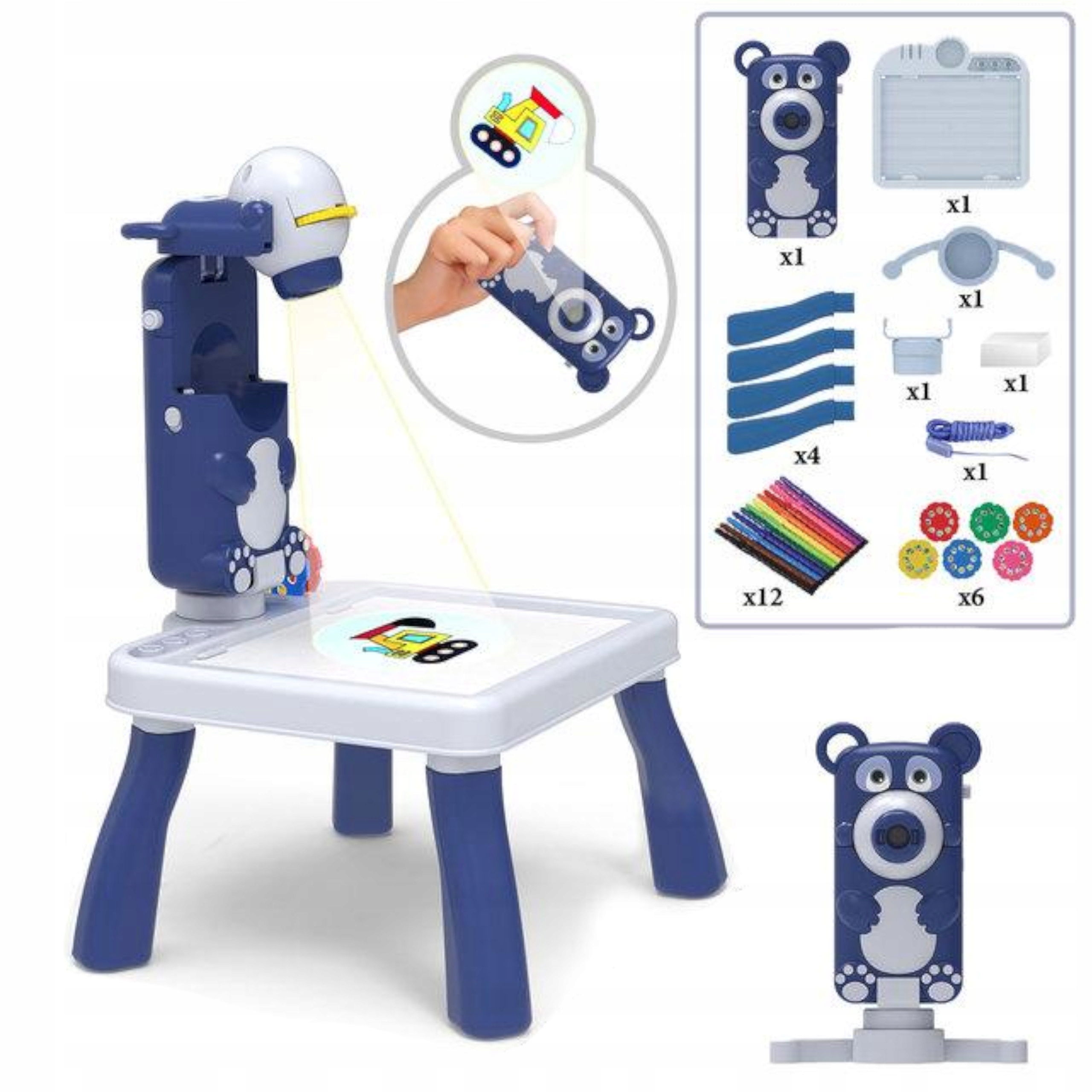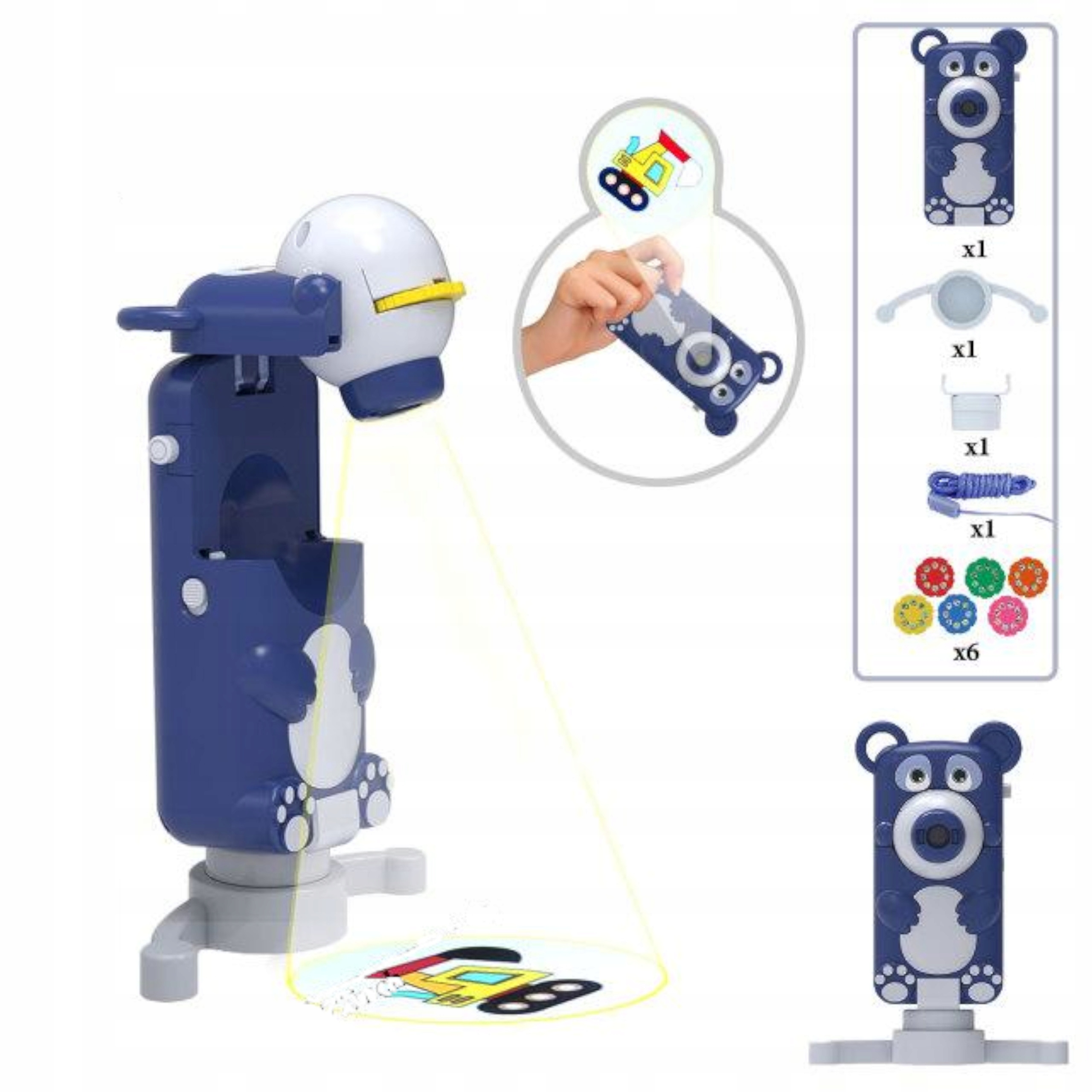 Projektor posiada 6 krążków – 3 krążki z obrazkami do odrysowywania i 3 krążki ze zdjęciami, które można wyświetlać na przykład na ścianie