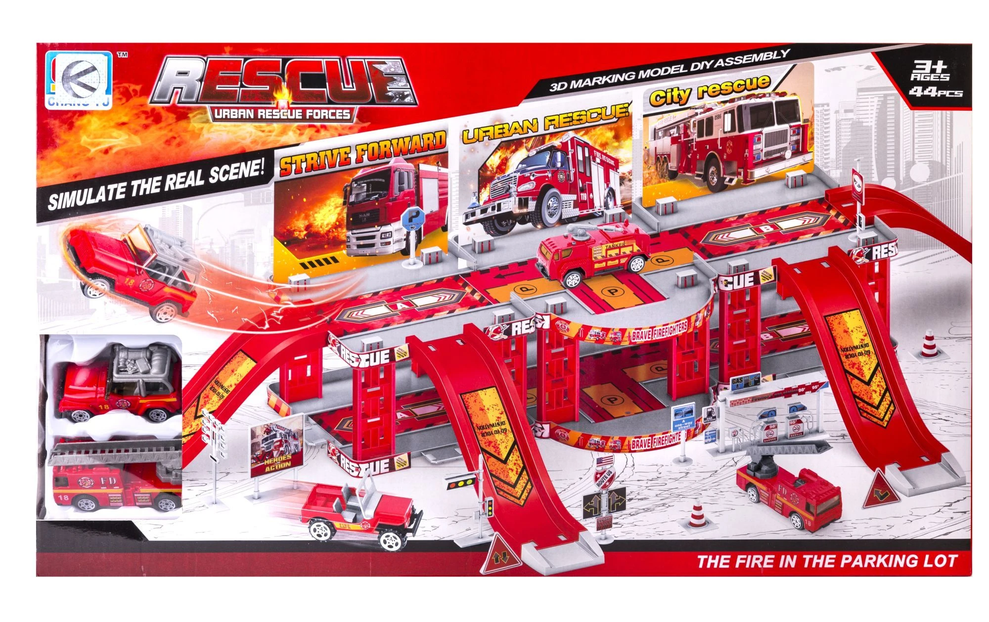 Zabawka będzie idealnym prezentem dla każdego dziecka, które jest miłośnikiem straży pożarnej. W zestawie znajdują się dwa autka o długości 7 cm. Parking samochodowy jest wyposażony w 4 podjazdy, znaki ostrzegawcze, stację benzynową. Zestaw ten zapewni dziecku wiele godzin wspaniałej zabawy.