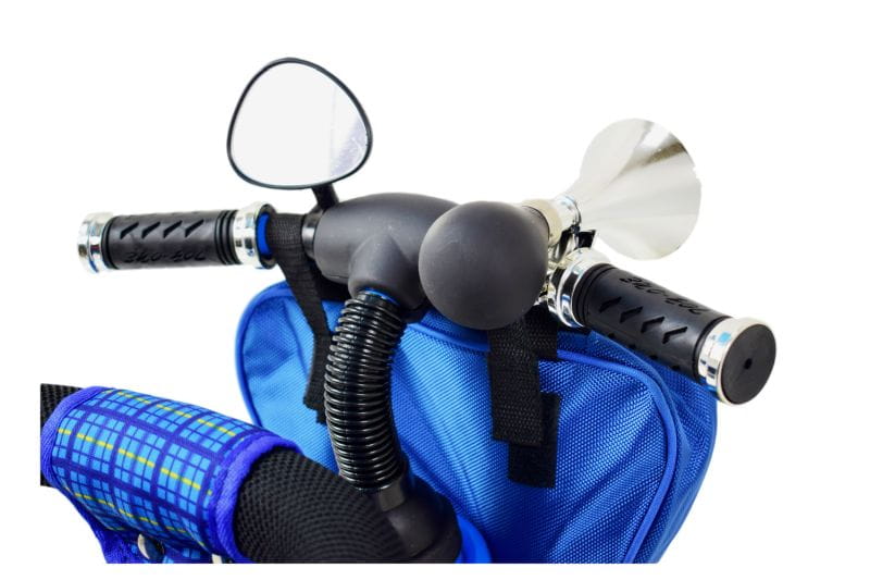 - z tyłu regulowany drążek połączony z kierownicą za pomocą cięgna sterującego, którym można w każdej chwili skorygować manewry dziecka, wysokość drążka można regulować w zakresie od 103 cm do 107 cm,