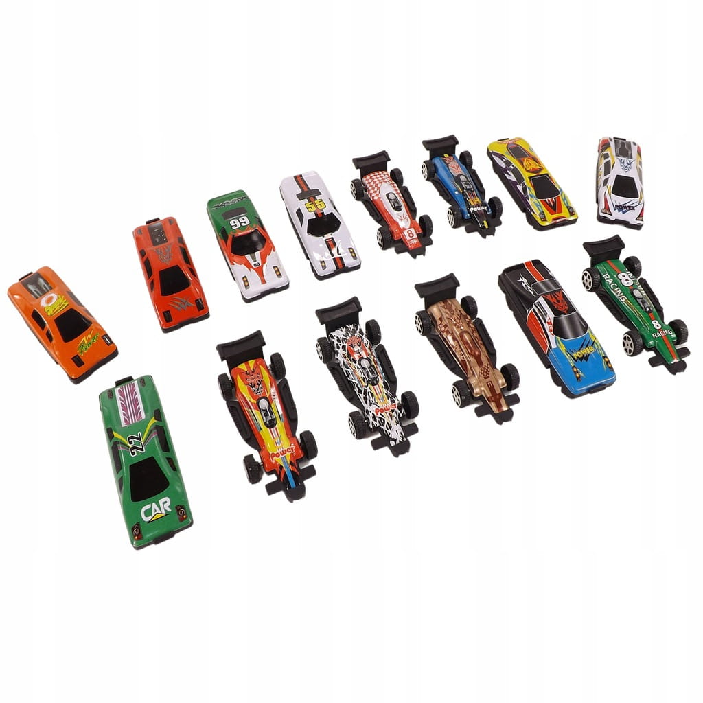 W skład zestawu wchodzą autka wyścigowe, bolidy w różnych kolorach i kształtach.