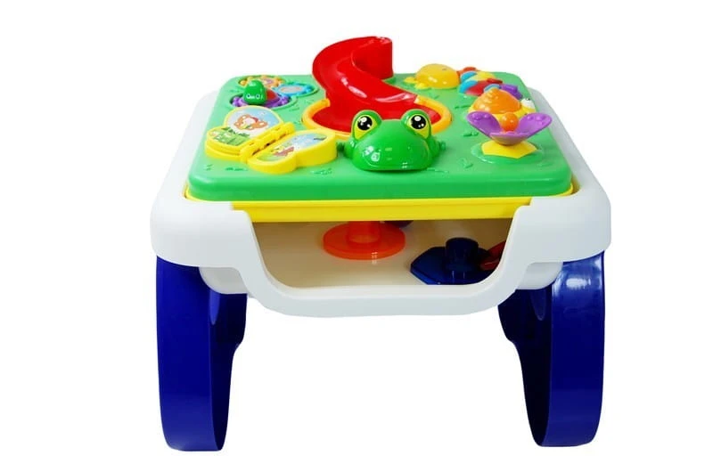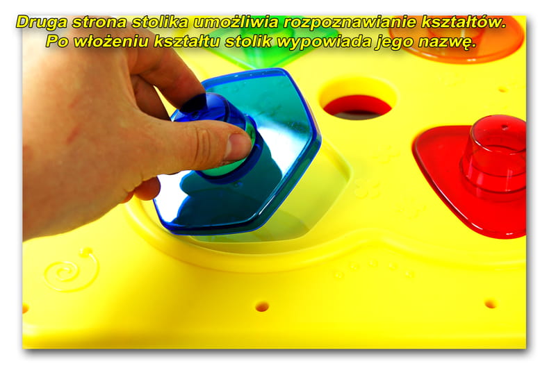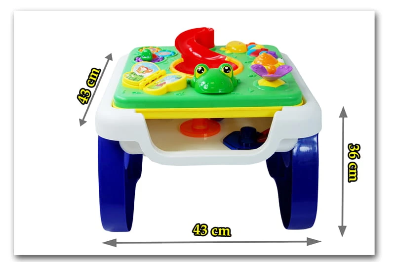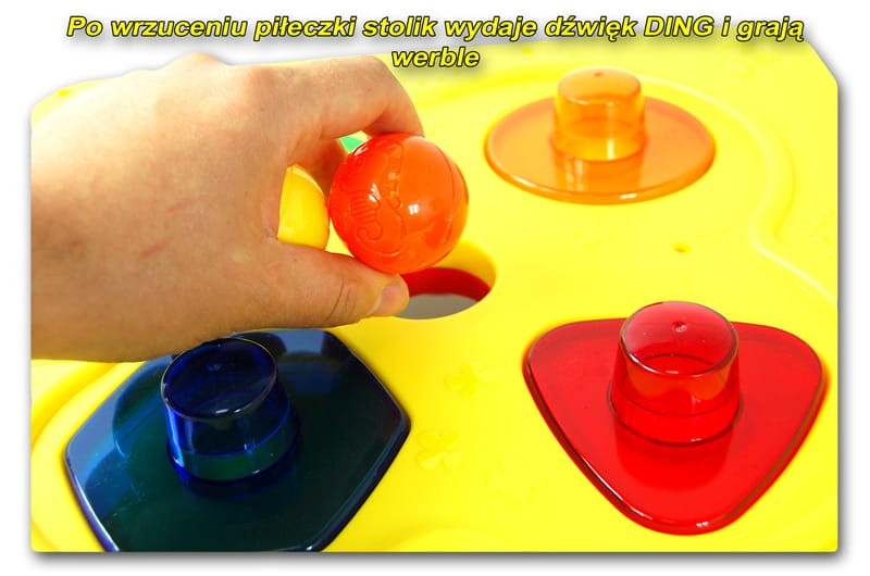 Wyjątkową atrakcją jest umieszczona w środku stoliczka zjeżdżalnia dla piłeczek ( w zestawie 4 piłeczki), gdy piłeczka wpadnie do otworu, wydobywa się dźwięk i świecą się światełka w zjeżdżalni.