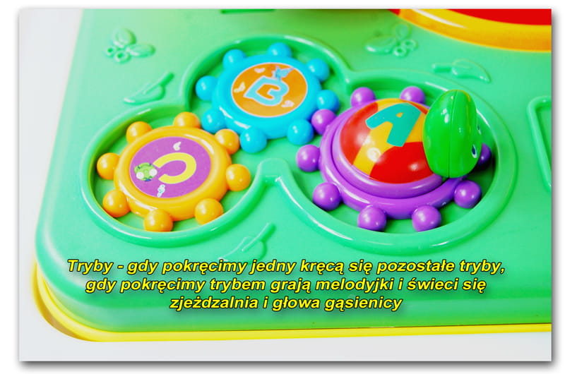 Tryby - po przekręceniu trybów w jedną lub w drugą stroną wydobywa się dźwięk i grają światełka w zjeżdżalni oraz w gąsienicy.
