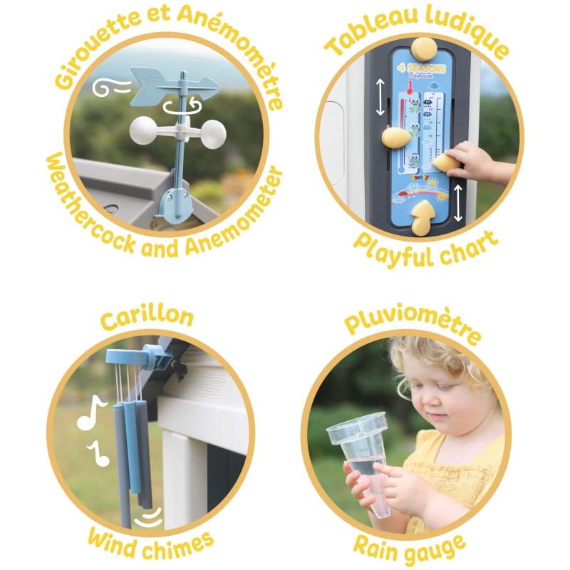 Domek Ogrodowy 4 Pory Roku od firmy Smoby to zabawka dla dzieci od 2 lat, która zachęca do aktywności na świeżym powietrzu. Domek ma kolorowy design i wiele ciekawych elementów, takich jak okna z żaluzjami, drzwi z dzwonkiem i wietrzne dzwonki. Domek jest także wyposażony w akcesoria do nauki pogody, takie jak deszczomierz, wiatrowskaz i panel meteorologiczny. Dzieci mogą obserwować zmiany temperatury, opadów i nasłonecznienia, a także zapisywać swoje odkrycia na panelu. Domek jest wykonany z wysokiej jakości tworzywa sztucznego, które jest odporne na blaknięcie i warunki atmosferyczne. Domek można także połączyć z innymi akcesoriami Smoby, takimi jak piaskownica, kuchnia letnia, podłoga, zraszacz lub donica ogrodowa (sprzedawane osobno). Domek Ogrodowy 4 Pory Roku to idealna zabawka dla małych odkrywców, którzy lubią bawić się na dworze.