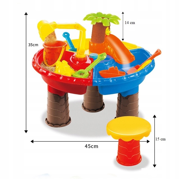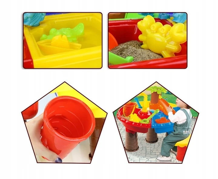 Stolik może być wykorzystywana zarówno w piasku jak i w wodzie. Posiada 3 komory. Jedna zaopatrzona jest w ruchome ramię koparki, drugie w zjeżdżalnię wodną.