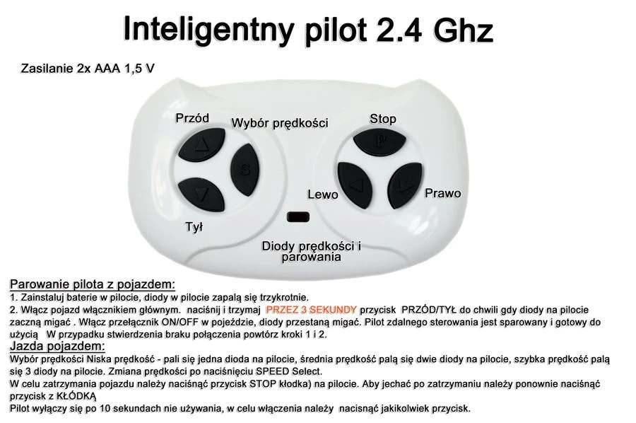 Rodzice mają pełną kontrolę nad jazdą Pociechy - w każdej chwili mogą zareagować pilotem na jazdę swojego Dziecka ( w innych modelach jest możliwa jazda na zdalnym sterowaniu tylko po przełączeniu włącznika R/C, tutaj takiego przełącznika nie ma). Dzięki właśnie takiemu rozwiązaniu kiedy Rodzice widzą że dziecko jedzie w złym kierunku mogą natychmiast zareagować pilotem - zmienić kierunek jazdy lub w tej wersji natychmiast zatrzymać pojazd - funkcja STOP w pilocie. Dodatkowo z pilota jest możliwe ustawienie 1 z 3 prędkości jazdy. Zdecydowanie jest to jedno z najbezpieczniejszych i najlepszych rozwiązań w pojazdach na akumulator