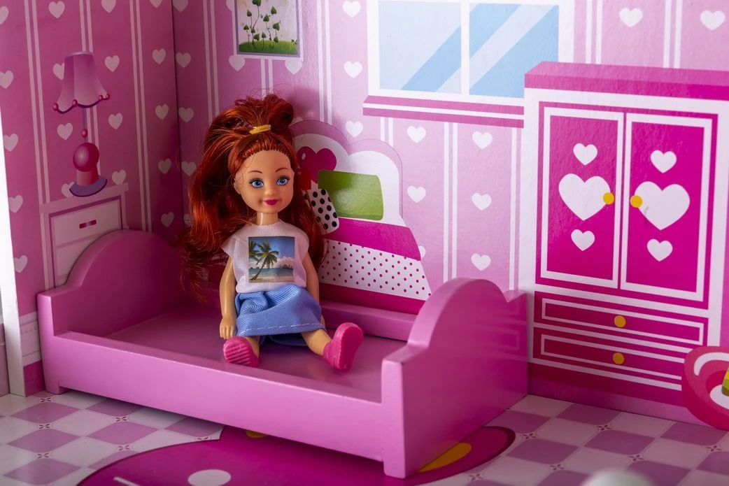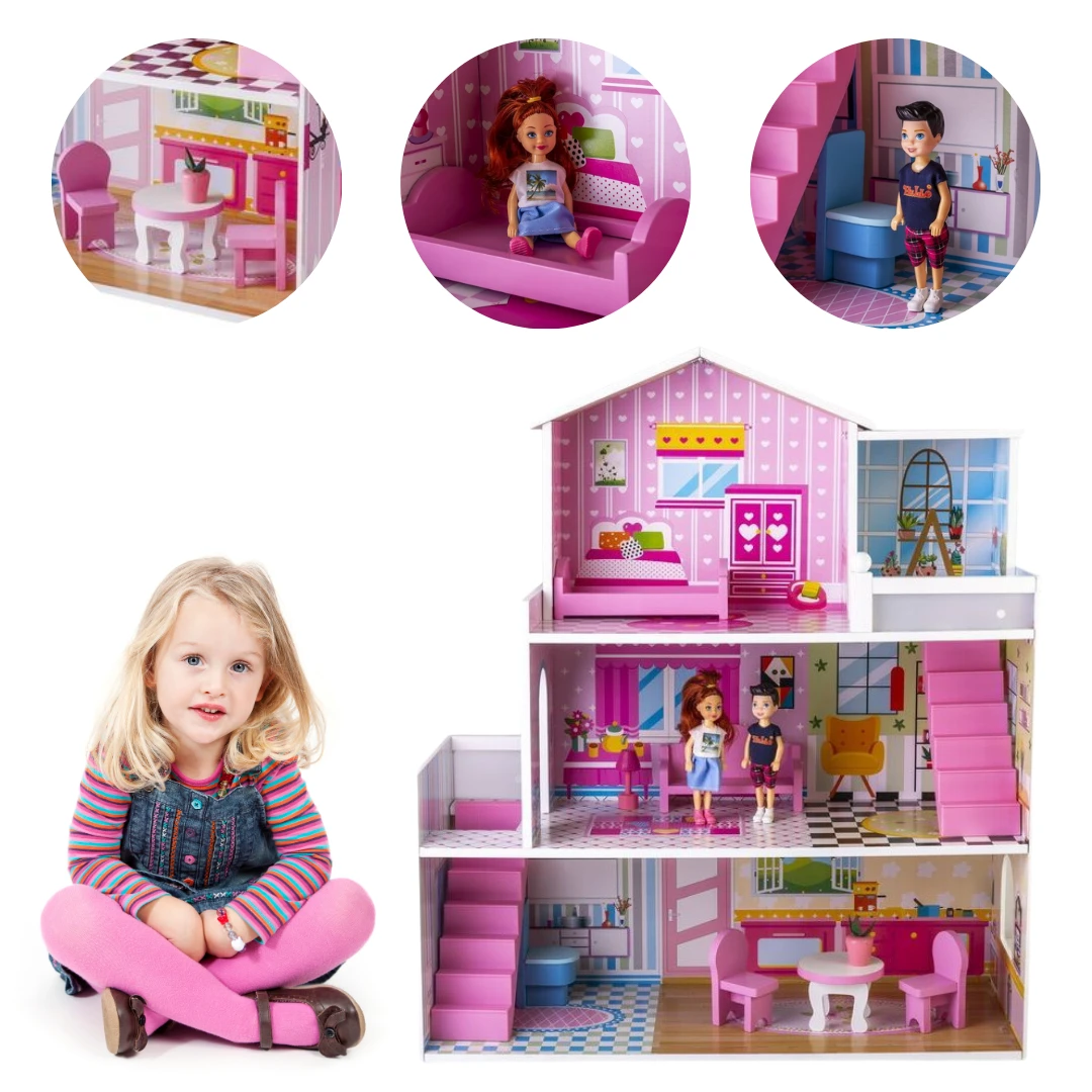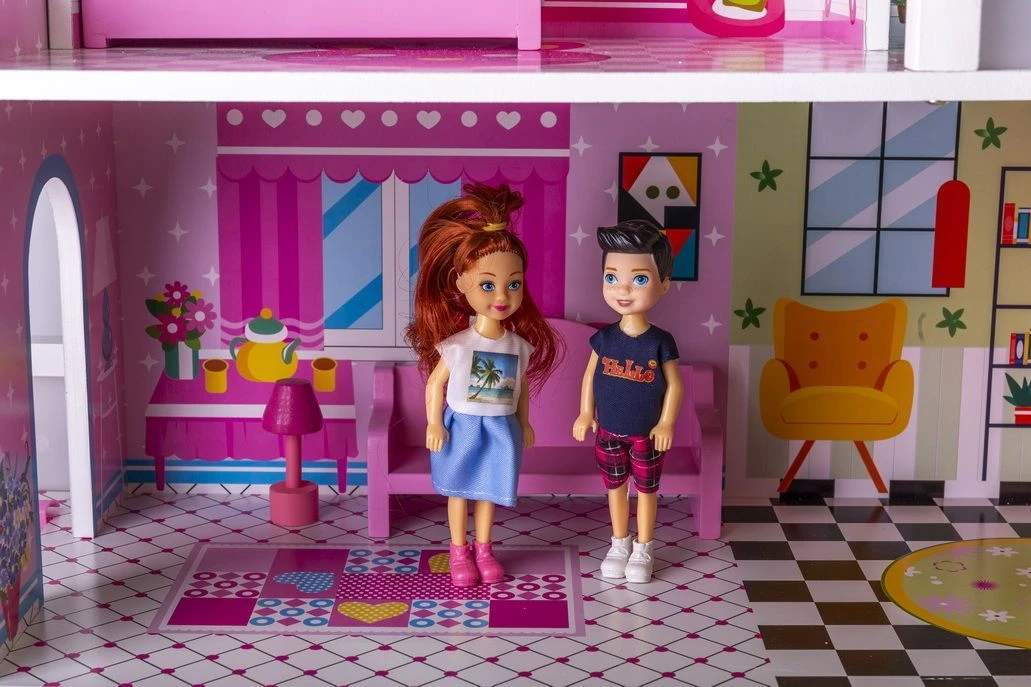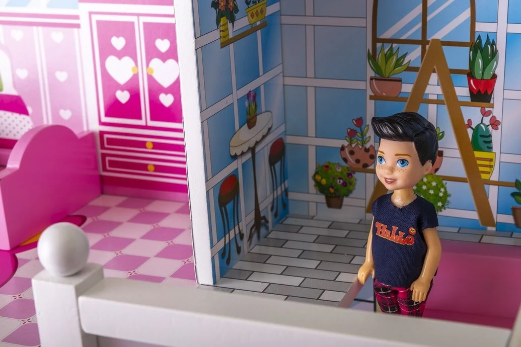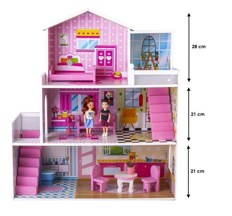 3-piętrowa willa dla lalek z pełnym wyposażeniem składa się z rozległej sypialni, słonecznego balkonu, przestronnego salonu, komfortowej łazienki oraz przytulnej jadalni. Z dwóch stron willi znajdują się różowe schody, dzięki którymi mieszkanki domku mogą swobodnie przemieszczać się między piętrami.
