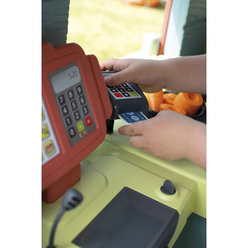 - - Funkcjonalna kuchnia: Domek wyposażony jest w lodówkę, piekarnik, kuchenkę gazową, zlew z kranem oraz kasę fiskalną z czytnikiem kart. To prawdziwe zaplecze do zabawy w restaurację!