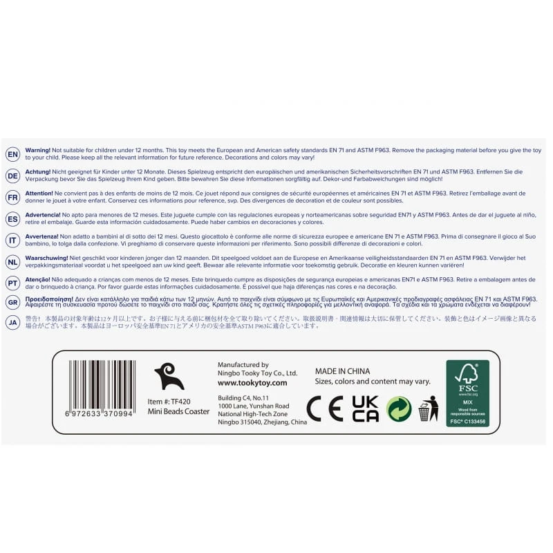 Tooky Toy to firma produkująca drewniane zabawki dla dzieci, obecna na rynku od 2004 roku. Kilkanaście lat doświadczenia w branży to gwarancja wysokiej jakości produktów, wytwarzanych z myślą o bezpieczeństwie dzieci. Zabawki Tooky Toy posiadają liczne certyfikaty potwierdzające bezpieczeństwo tych ekologicznych produktów. Dobrze wygładzone, wolne od drzazg i ostrych krawędzi zabawki, pokryte są wyłącznie bezpiecznymi, nietoksycznymi farbami, barwnikami i lakierami. To wszystko sprawia, że zabawki Tooky Toy są uwielbiane przez dzieci i doceniane przez rodziców na całym świecie.