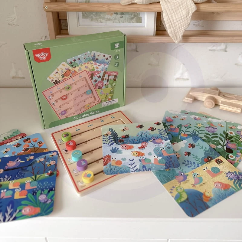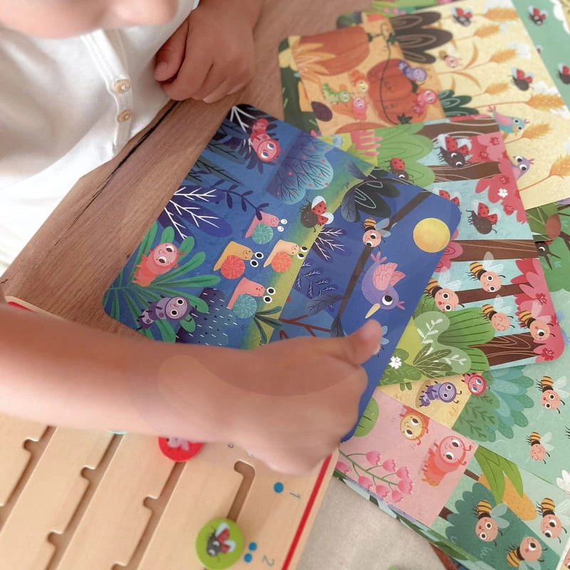 Wylosuj lub wybierz dowolną kartę i policzcie ile jest zwierzątek. Na odwrocie kart znajdziecie odpowiedzi do zadania, dzięki temu dziecko może grać także samodzielnie. Na drewnianej tabliczce znajdziecie pinezkę z biedronką, pszczółką, ślimakiem, ptaszkiem lub gąsienicą i zaznaczcie ile jest ich na obrazku. Poćwiczcie przy tym polskie i angielskie nazwy zwierzątek.