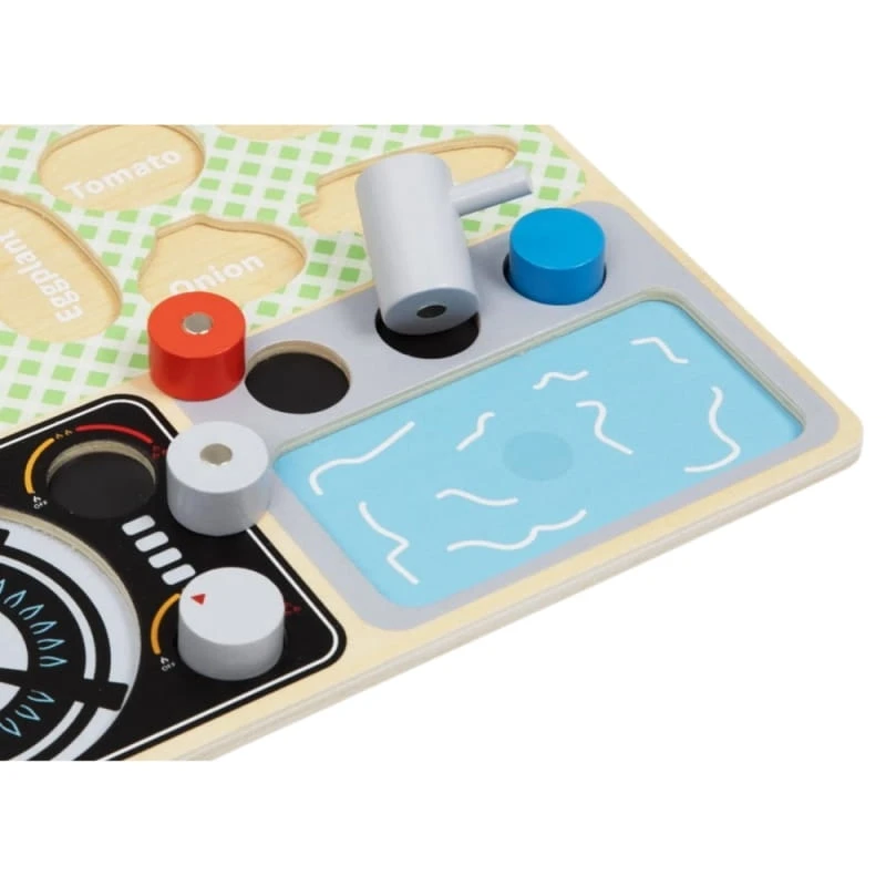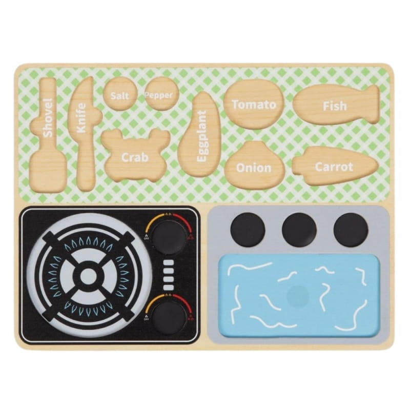 - ✔️ Wygodna plansza, dzięki której dziecko poznaje nazwy warzyw, sztućców kuchennych i innych przedmiotów związanych z gotowaniem i jedzeniem