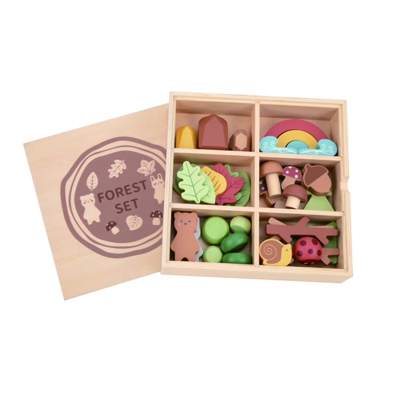 Drewniany Zestaw Leśny od Tooky Toy stworzony z myślą o zapewnieniu dzieciom niezapomnianych chwil pełnych kreatywnej zabawy. W pudełku znajdują się różnorodne elementy lasu, które umożliwiają sortowanie, układanie w stosy oraz budowanie, pozwalając na kreowanie niepowtarzalnego środowiska leśnego.