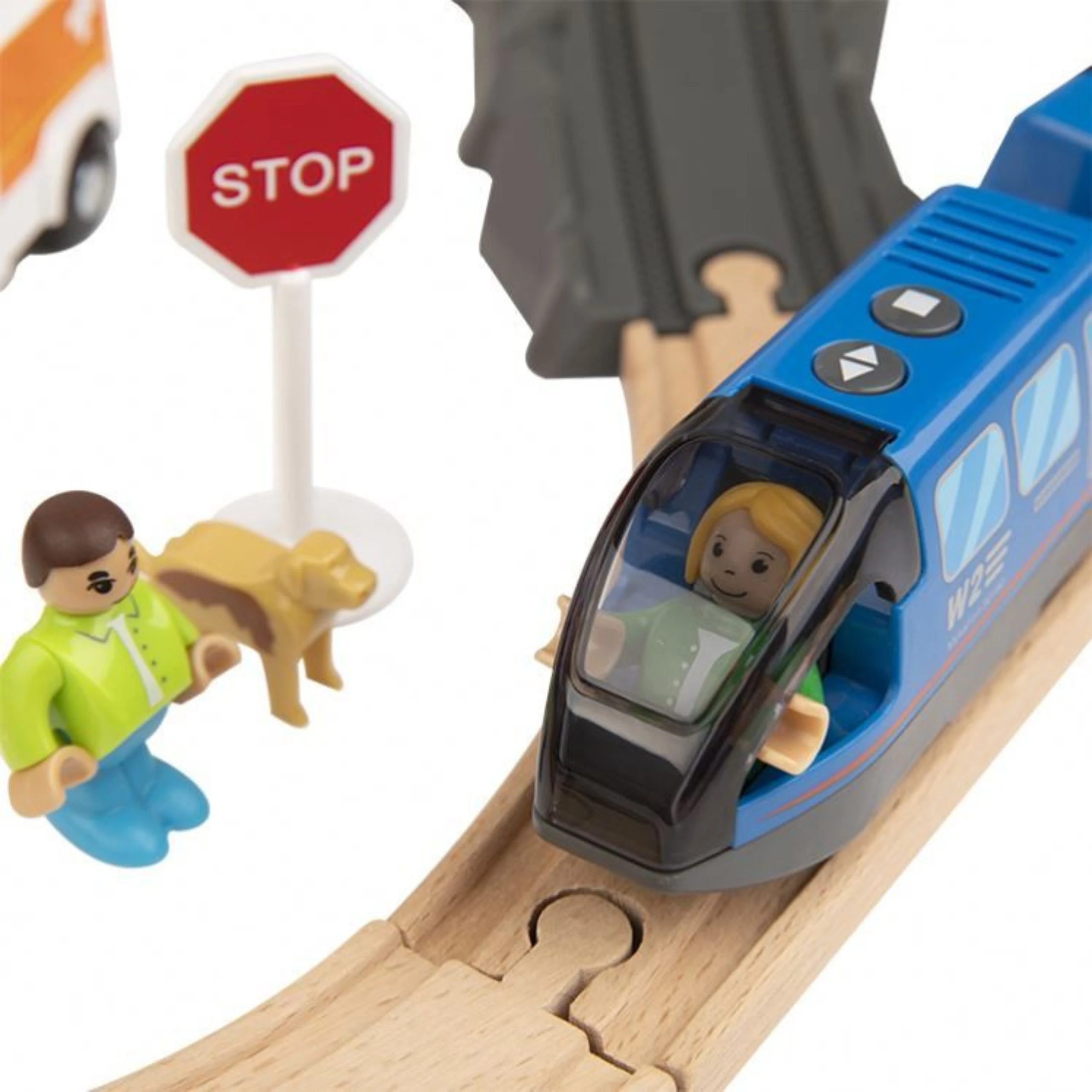 - Nowoczesny niebieski pociąg z napędem elektrycznym, biegiem wstecznym, efektami dźwiękowymi i otwieraną kabiną