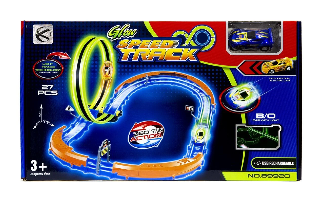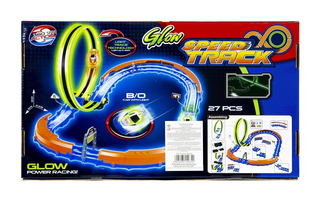Świecący tor samochodowy to idealny pomysł na na prezent dla najmłodszych miłośników wyścigów samochodowych. Produkt jest łatwy w złożeniu i zapewni długie godziny wspaniałej zabawy. Zestaw składa się z toru liczącego 27 elementów oraz 1 auta (7 cm) ze światłami. Dodatkową atrakcją są fluorescencyjne elementy, które są podświetlane przez lampki samochodu jeżdżącego po torze.