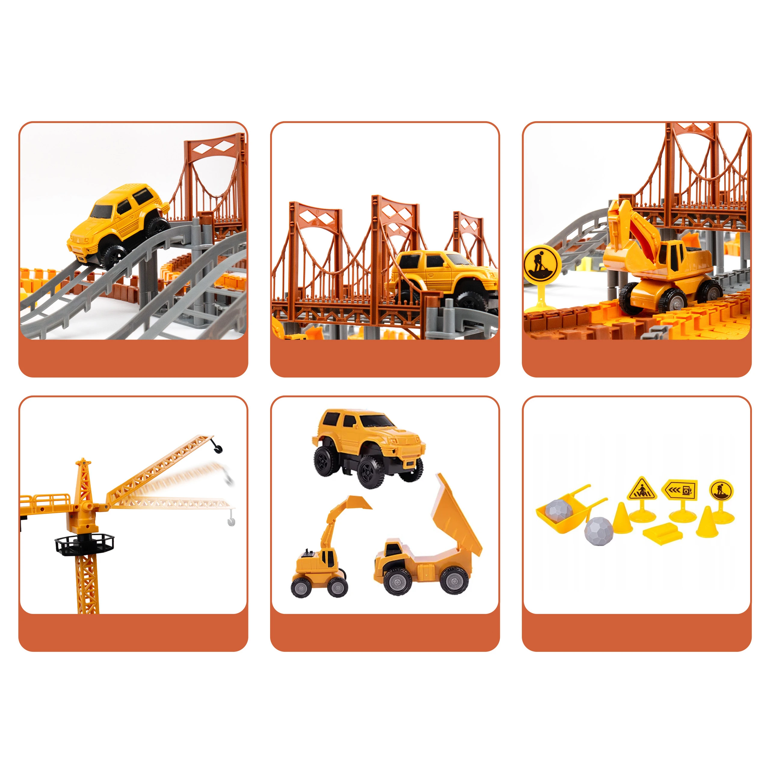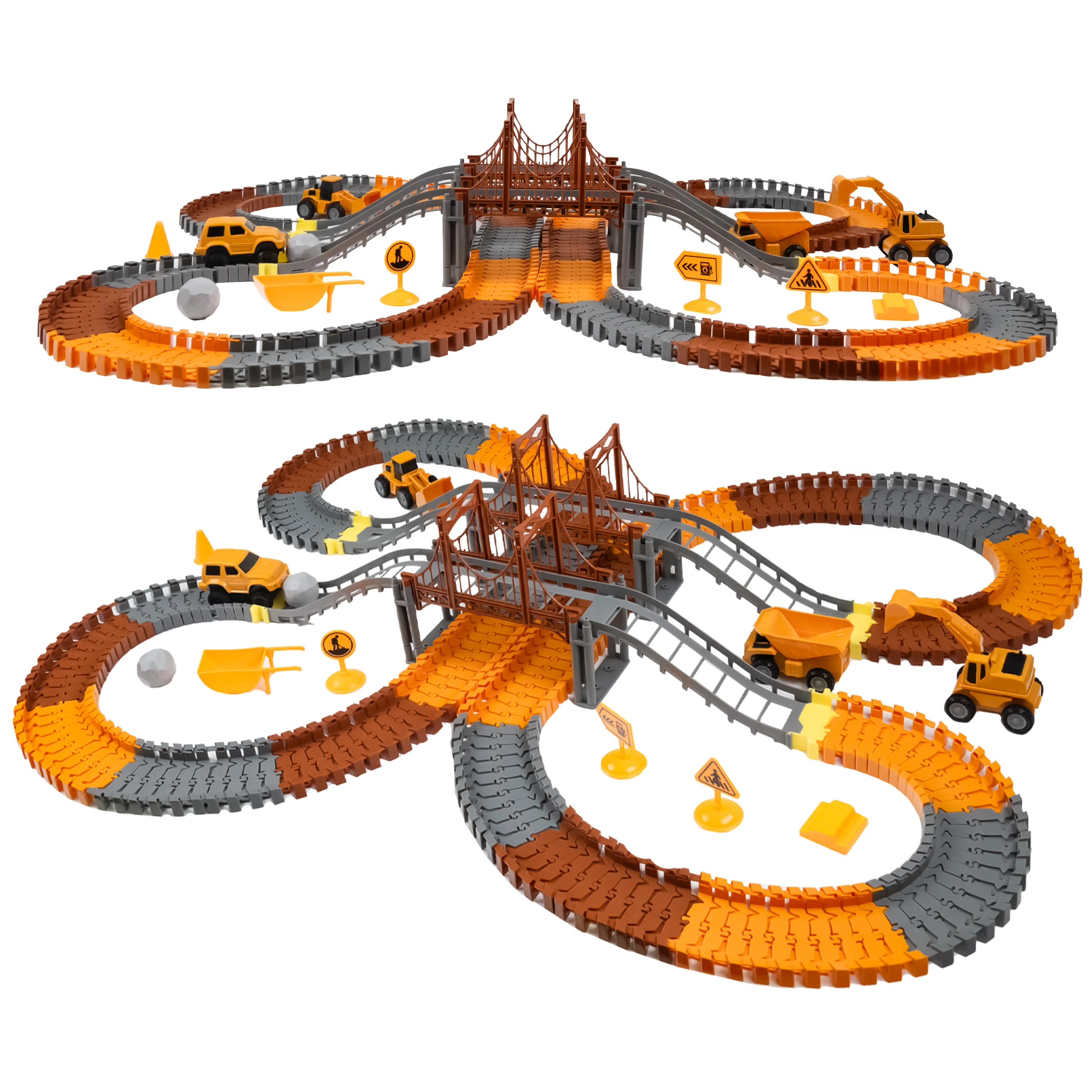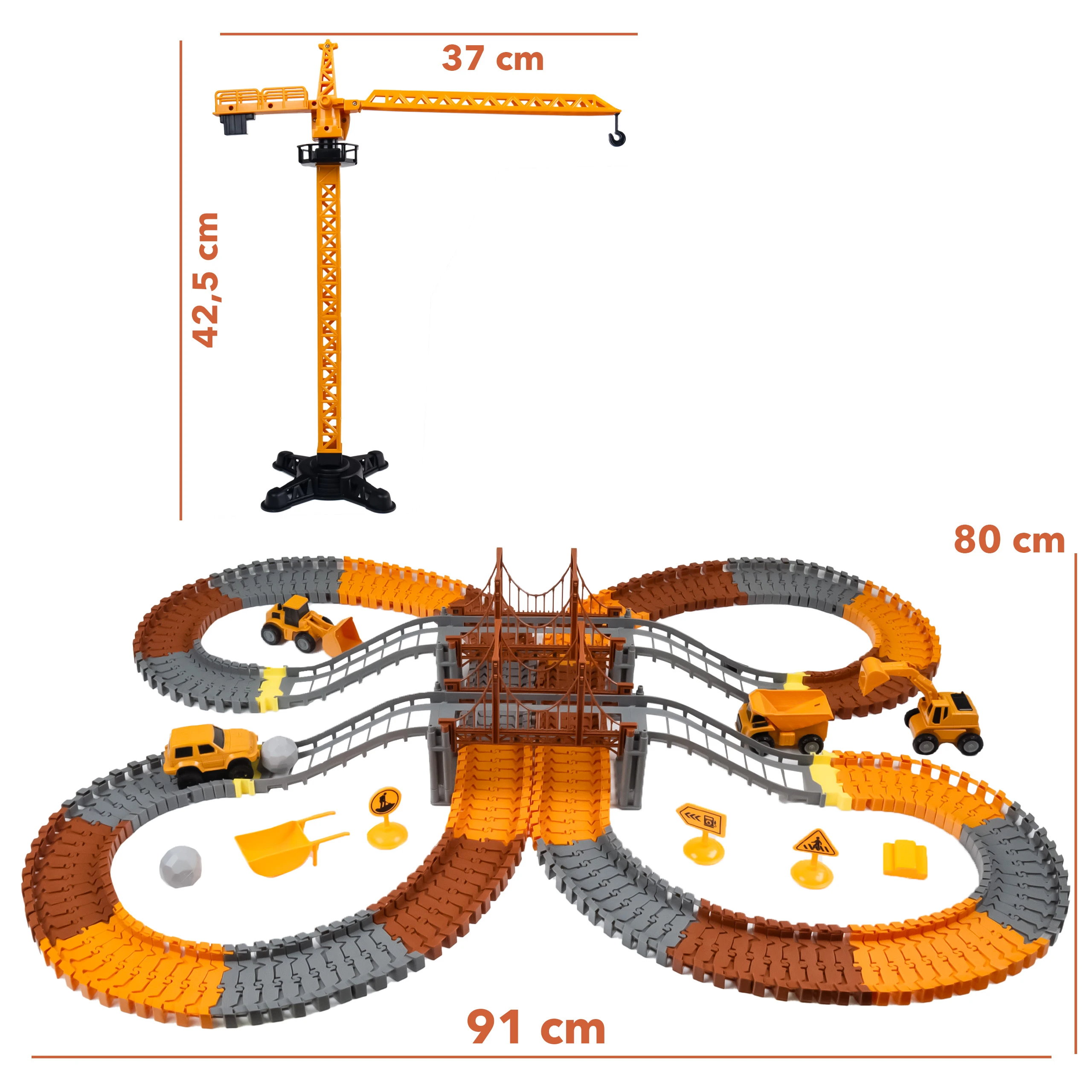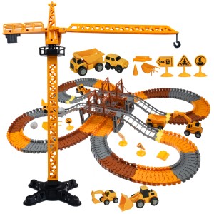 Zestaw torów wyścigowych o tematyce budowlanej zawiera 273 części, które zachęcają dzieci do konstruowania własnych przemysłowych światów.