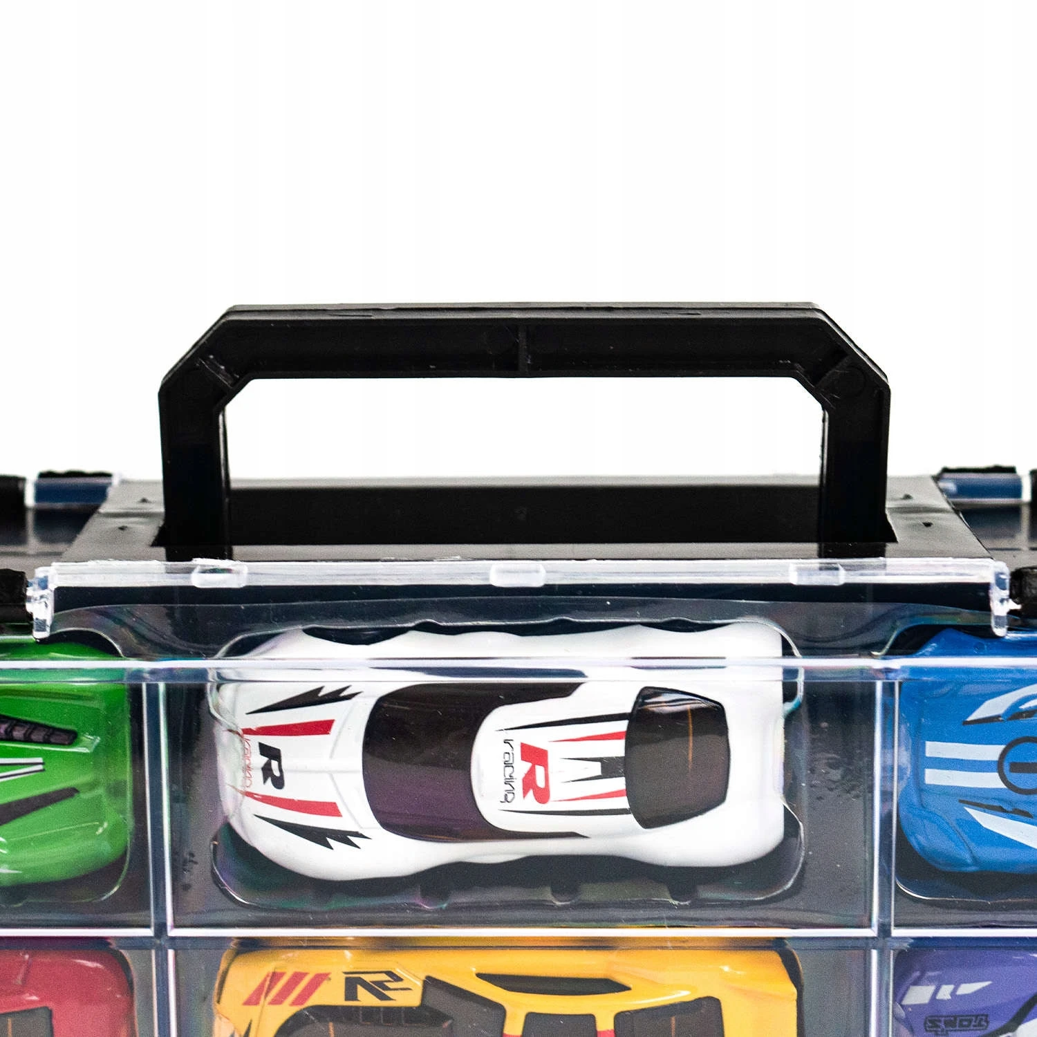 Walizka z wygodnym uchwytem pozwala dziecku zabierać swój zestaw gdzie tylko chce. Zamykane ścianki chronią przed możliwością zagubienia resoraków.