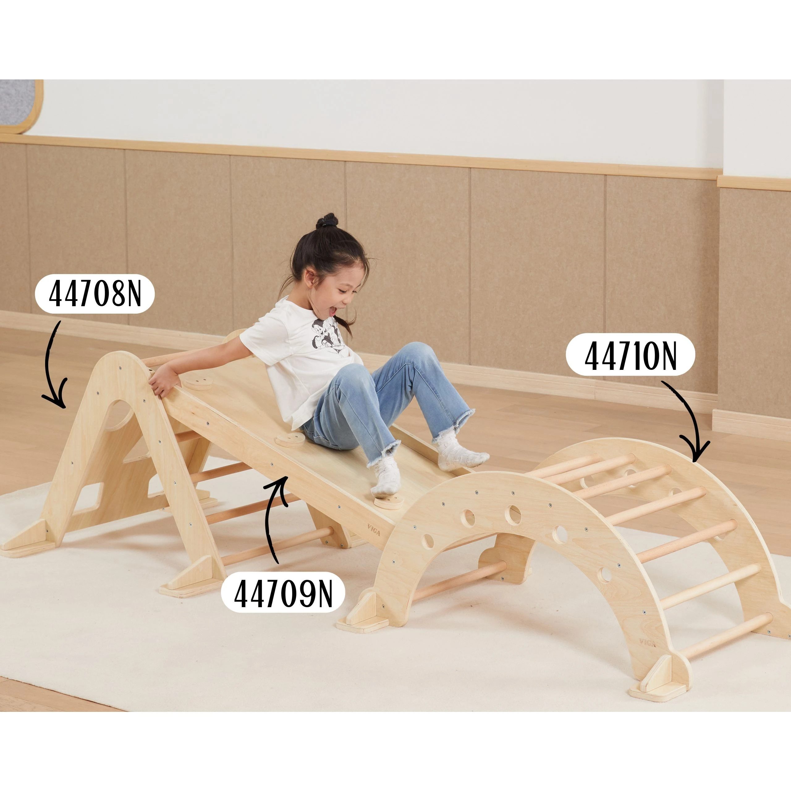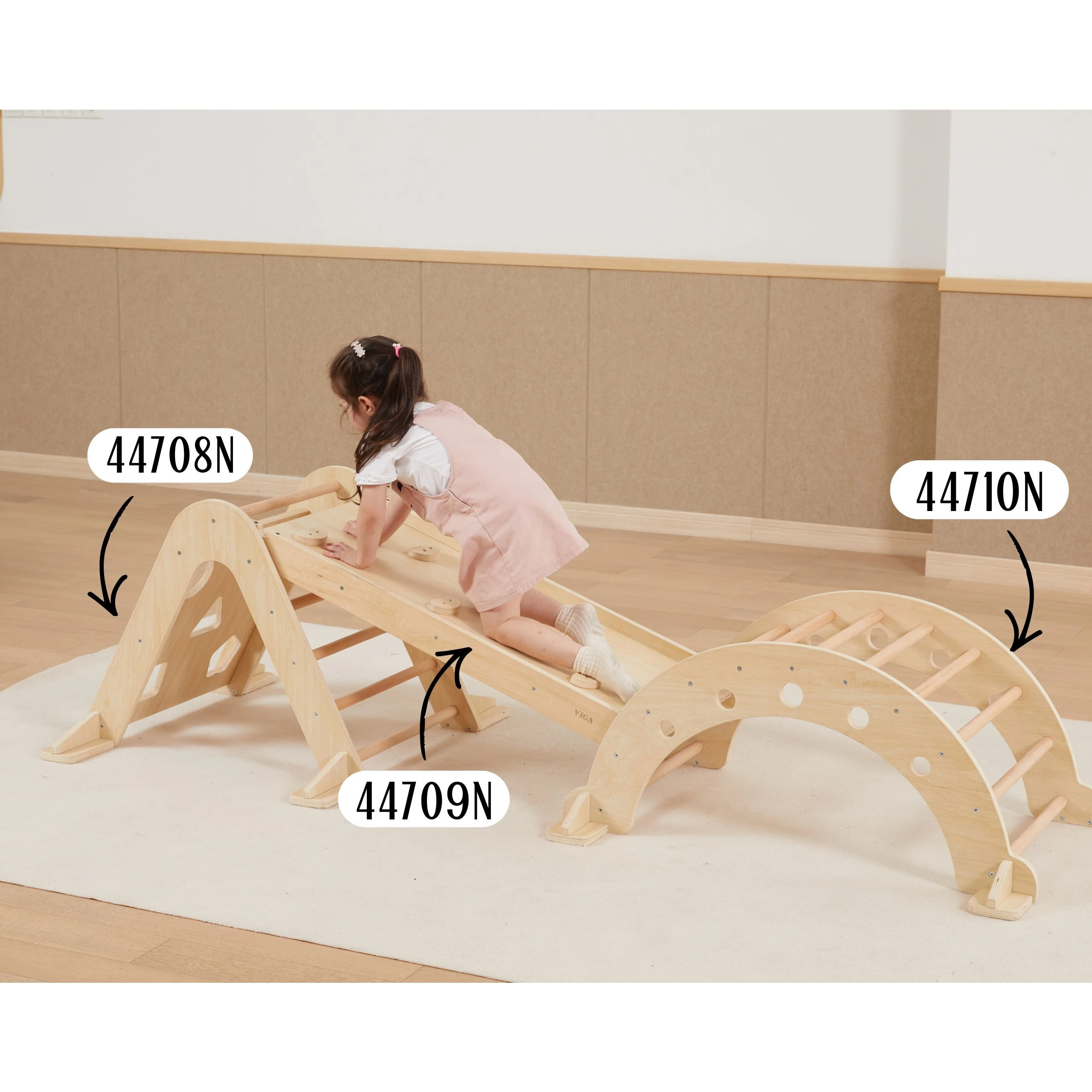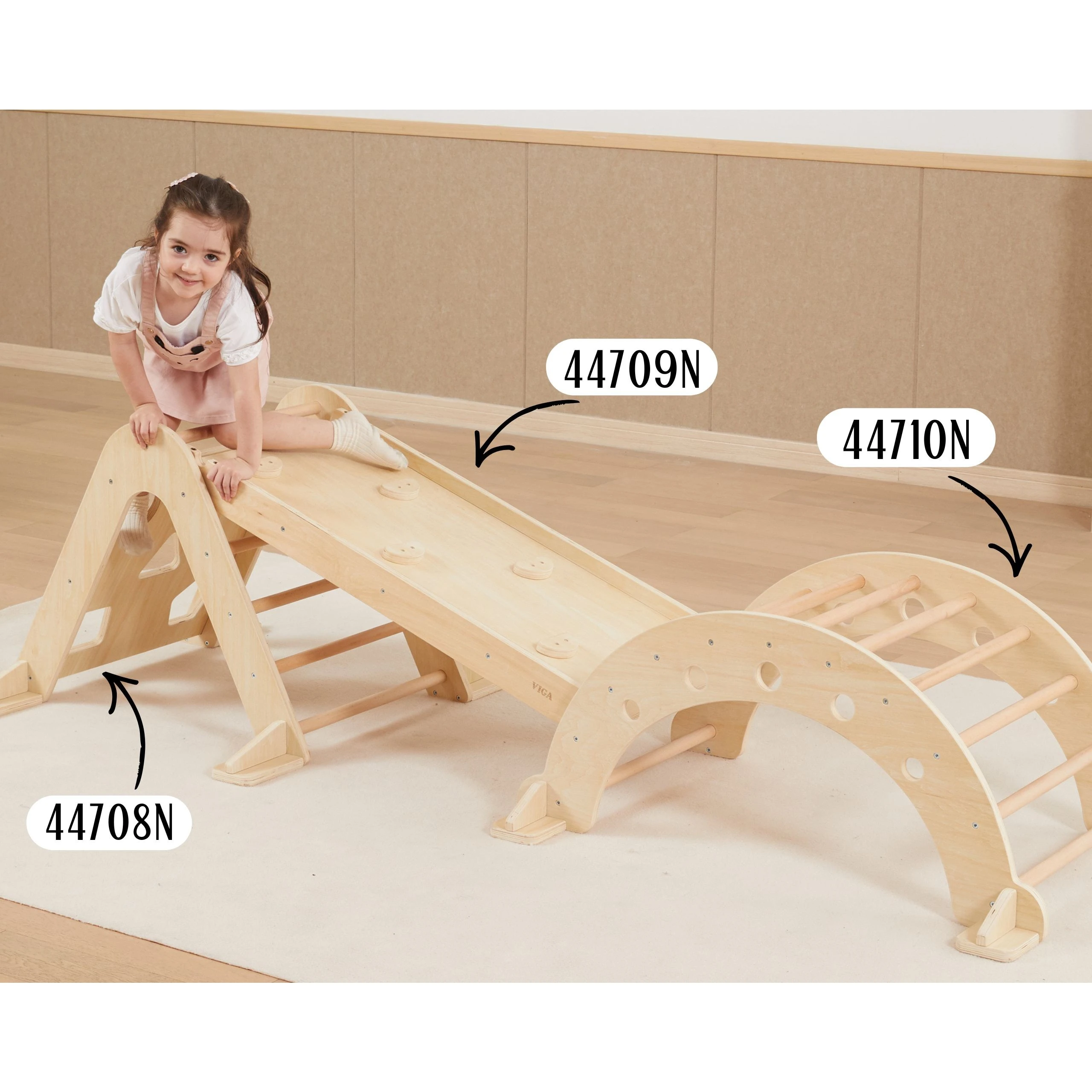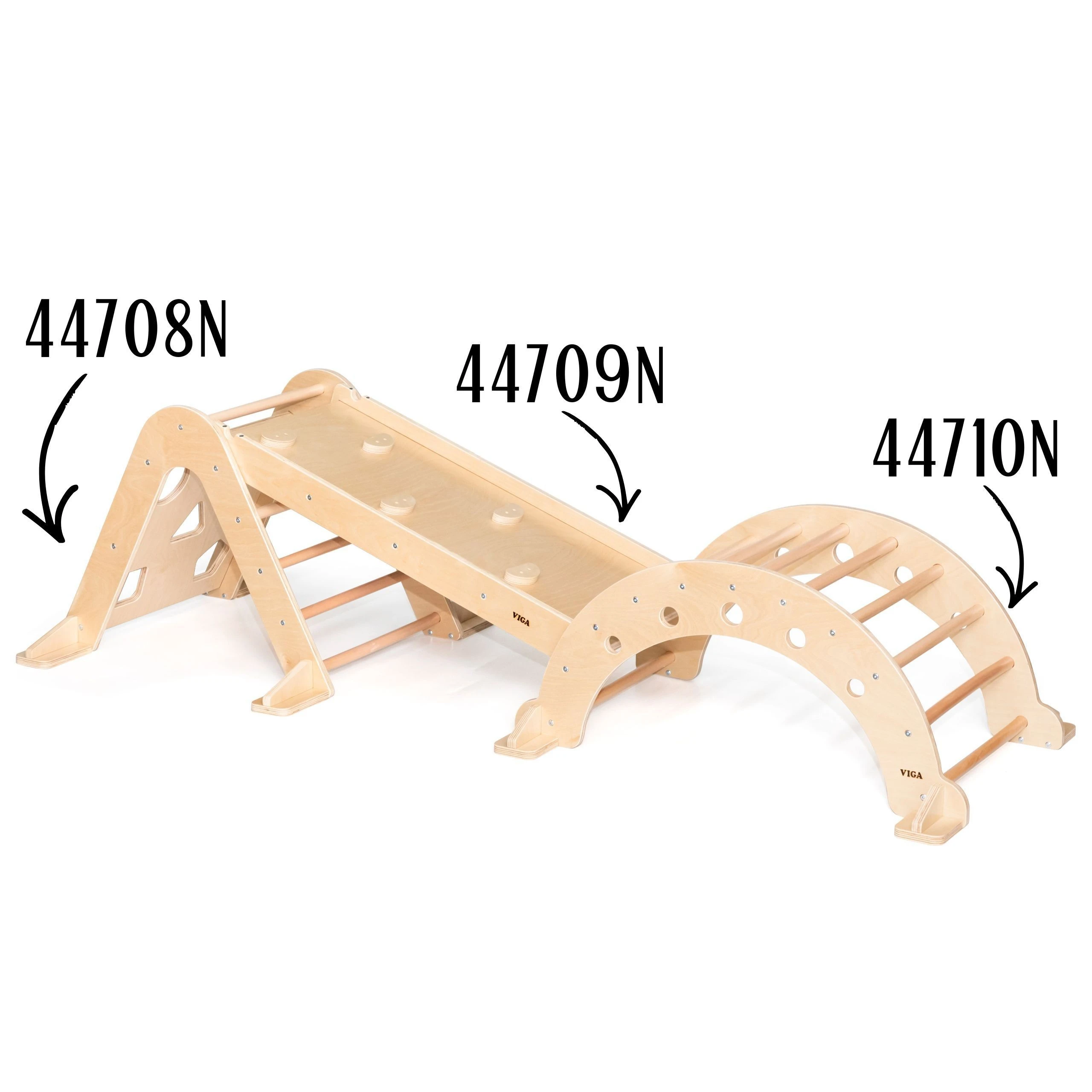 Trójkąt Wspinaczkowy Pikler jest nieodzownym elementem domowego placu zabaw wpisanego w filozofię Montessori. Podczas wspinaczki dziecko ćwiczy motorykę dużą, trenuje zmysł równowagi, a także poprawi koordynacje ruchową własnego ciała. Wchodzenie na drabinkę powinno się odbywać w towarzystwie dorosłego. Z jednej strony do pokonania dziecko znajdzie klasyczną drabinkę, natomiast na drugiej ściankę z różnymi otworami wspinaczkowymi. Do zestawu można dokupić drewnianą zjeżdżalnię (44709), która po odwróceniu może pełnić rolę dodatkowej ścianki lub za jej pomocą można połączyć ten trójkąt wspinaczkowy razem z bujakiem (44708).