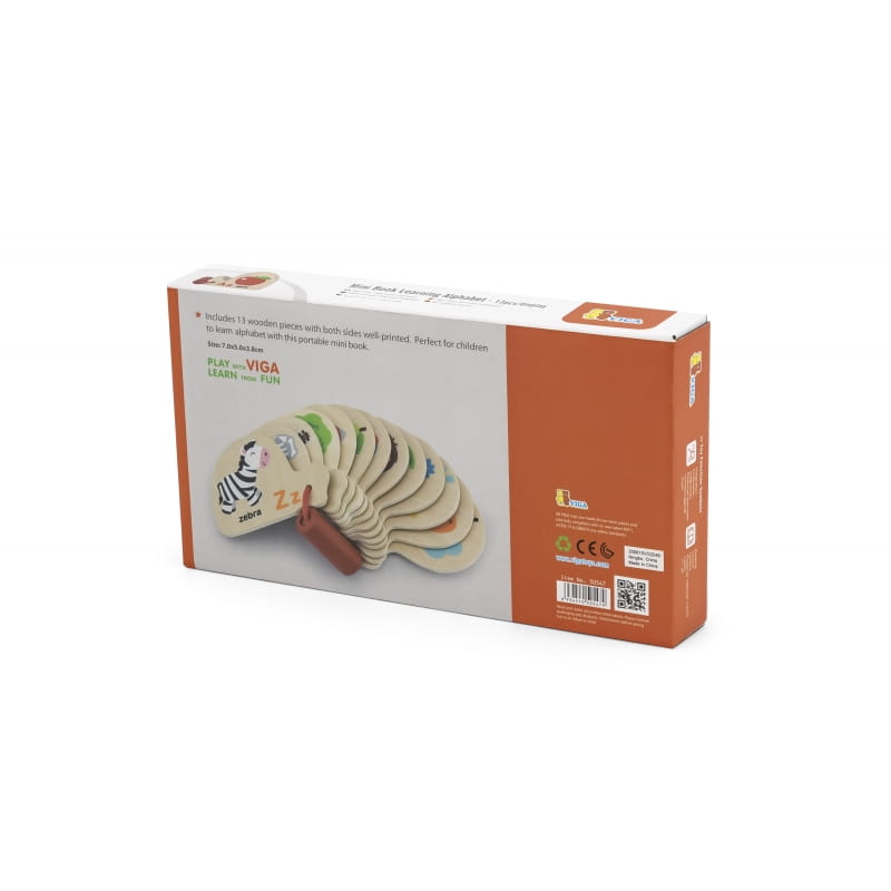 Zestaw do nauki alfabetu zaprojektowany przez cenionego producenta zabawek drewnianych firmę Viga Toys dla dzieci od 12 miesiąca życia, to świetny pomysł do przedszkola jak i do domu. Drewniane karty połączone są czerwonym sznureczkiem. Na każdej karcie znajduje się inny obrazek, litera i pełna nazwa przedstawionego elementu w języku angielskim. Zabawka uczy dziecko literek, pomaga kształtować ruchy małych rączek, dodatkowo dziecko poznaje pierwsze słowa w języku angielskim.