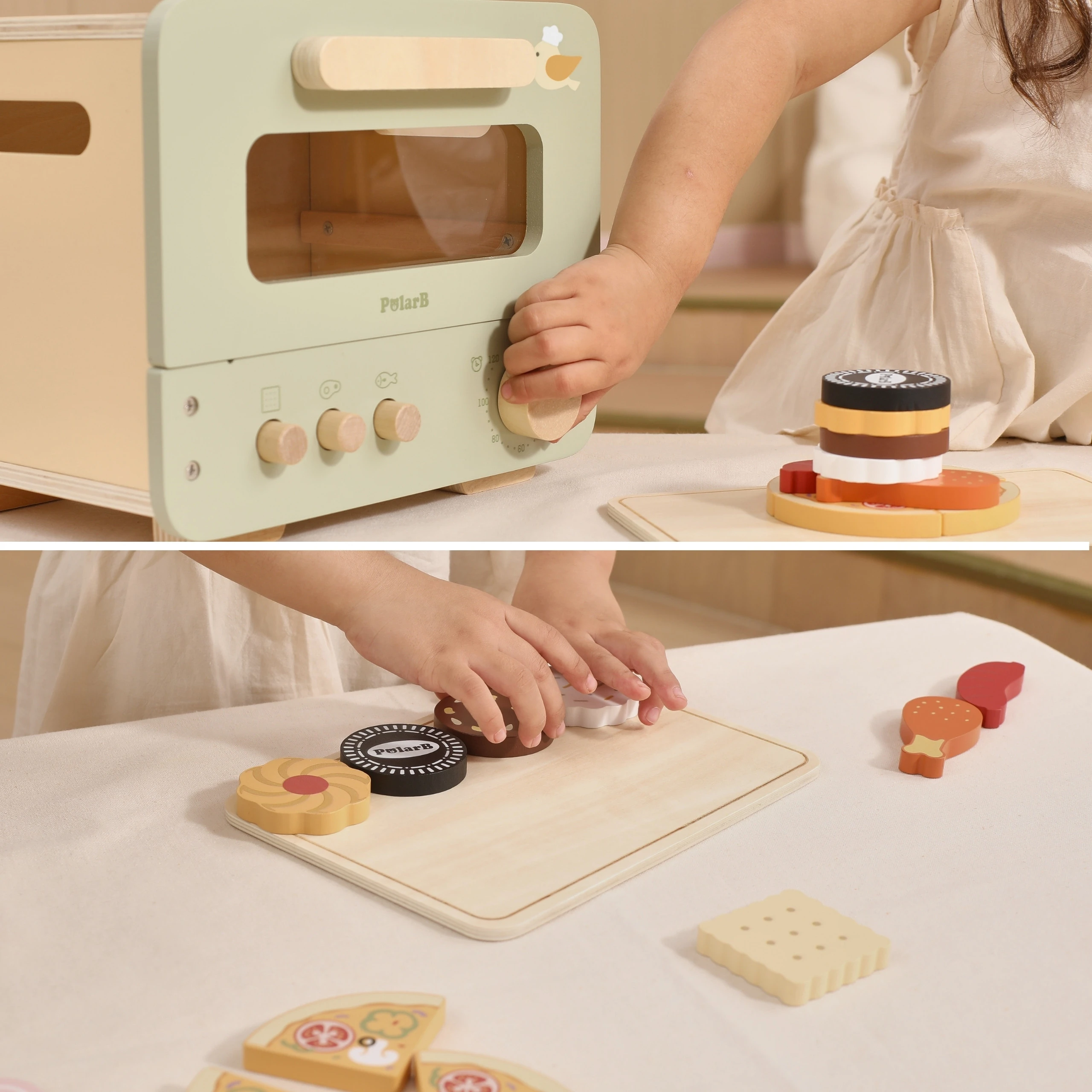 Zestawowi do Pieczenia Słodko-Pikantnych Potraw od VIGA! Ten innowacyjny zestaw, stylizowany na nowoczesny toster/piekarnik w modnym, zielonym odcieniu, idealnie nadaje się do odgrywania ról w kuchni. W zestawie znajduje się 12 realistycznych, drewnianych akcesoriów spożywczych, w tym pyszne ciasteczka, mini pizza (krojona na 4 części), kiełbaska oraz udko kurczaka. Piekarnik ma otwieraną klapę, ruchome pokrętła i wysuwaną tacę, co sprawia, że zabawa jest niezwykle autentyczna. Zabawa w pieczenie i gotowanie nie tylko zapewnia świetną rozrywkę, ale także intensywnie rozwija małą motorykę, koordynację wzrokowo-ruchową, a także kreatywność i świadomość społeczną. Dzięki temu zestawowi, maluchy mogą naśladować dorosłych, uczyć się serwowania i dzielenia posiłków. To idealny dodatek do każdej drewnianej kuchni, gwarantujący godziny bezpiecznej i rozwijającej zabawy!