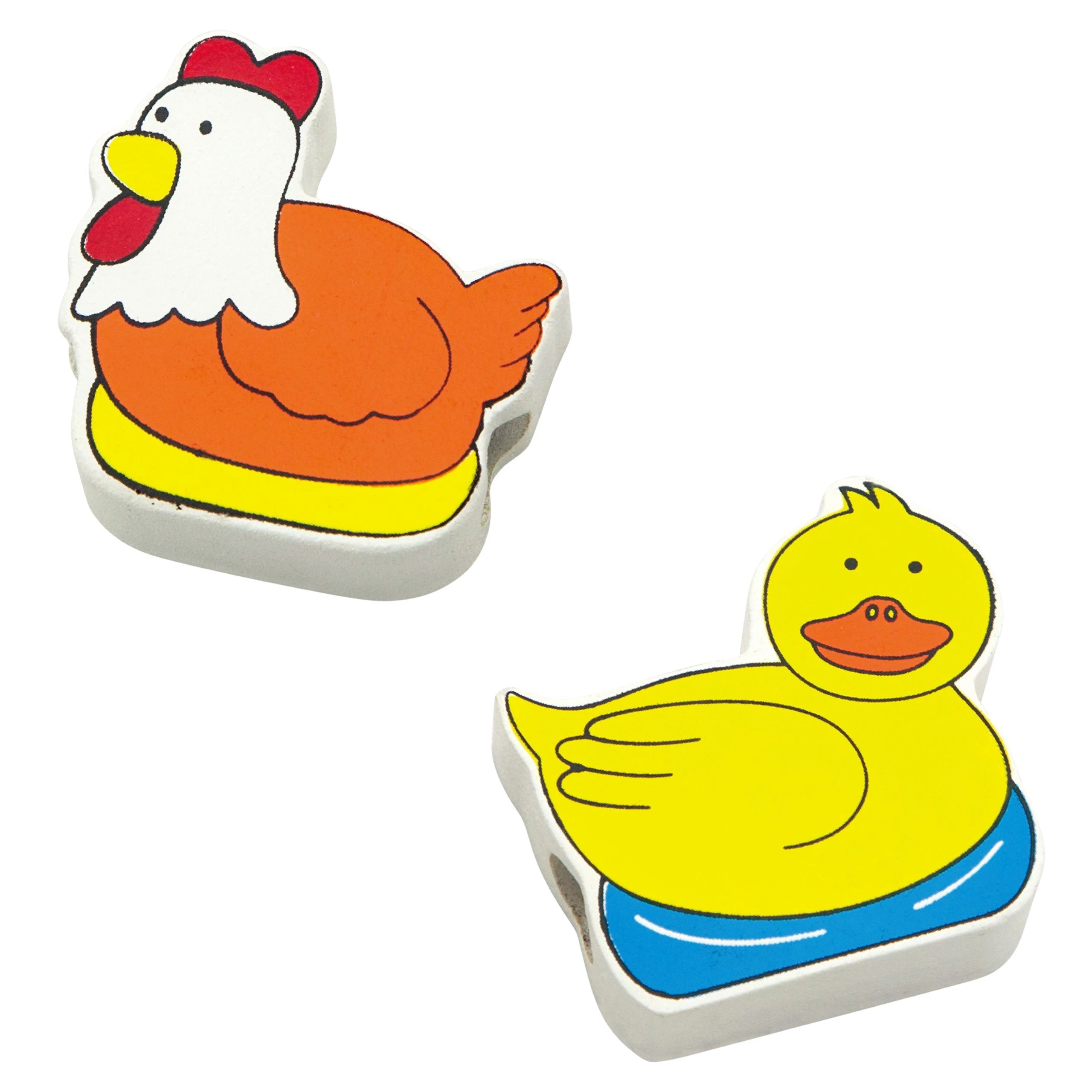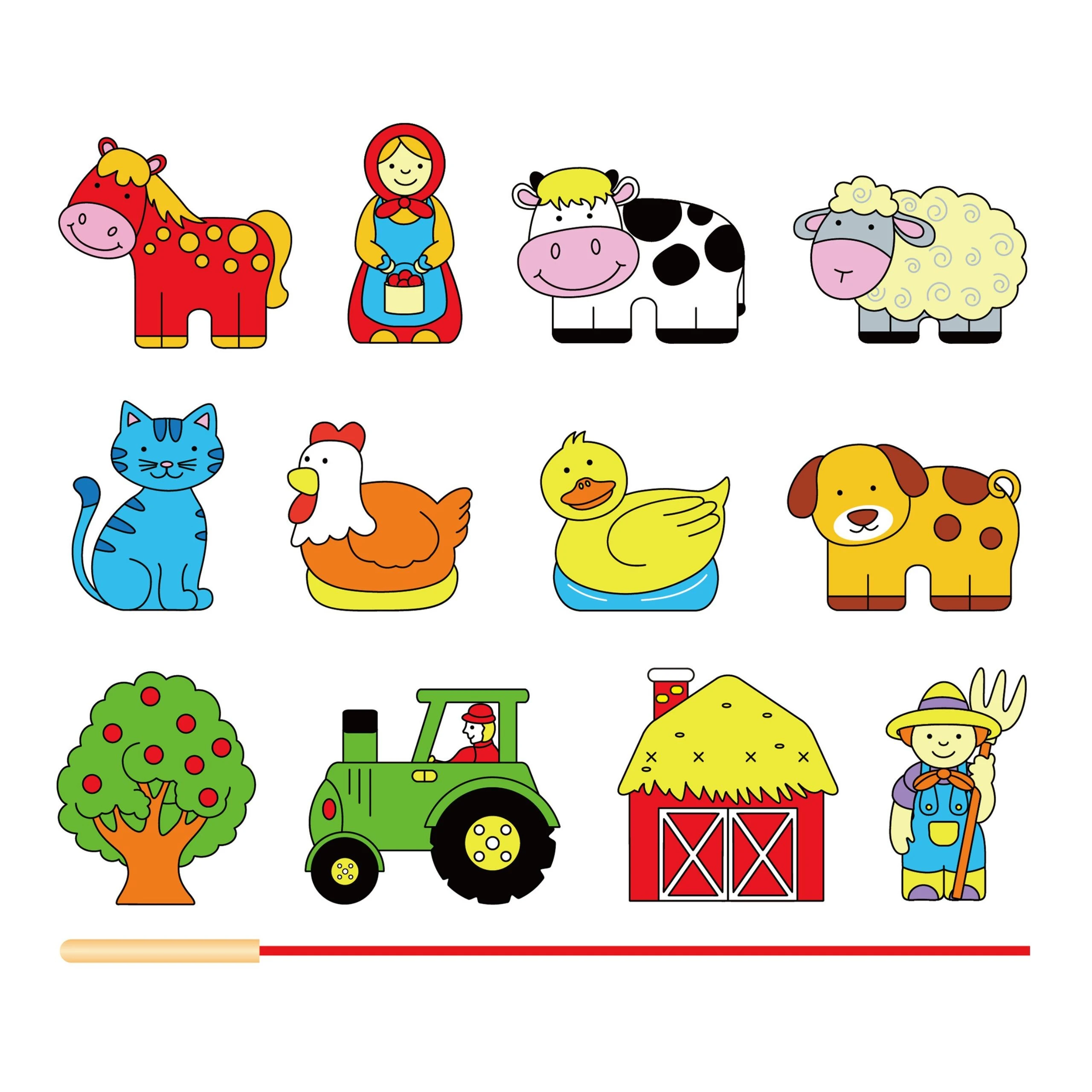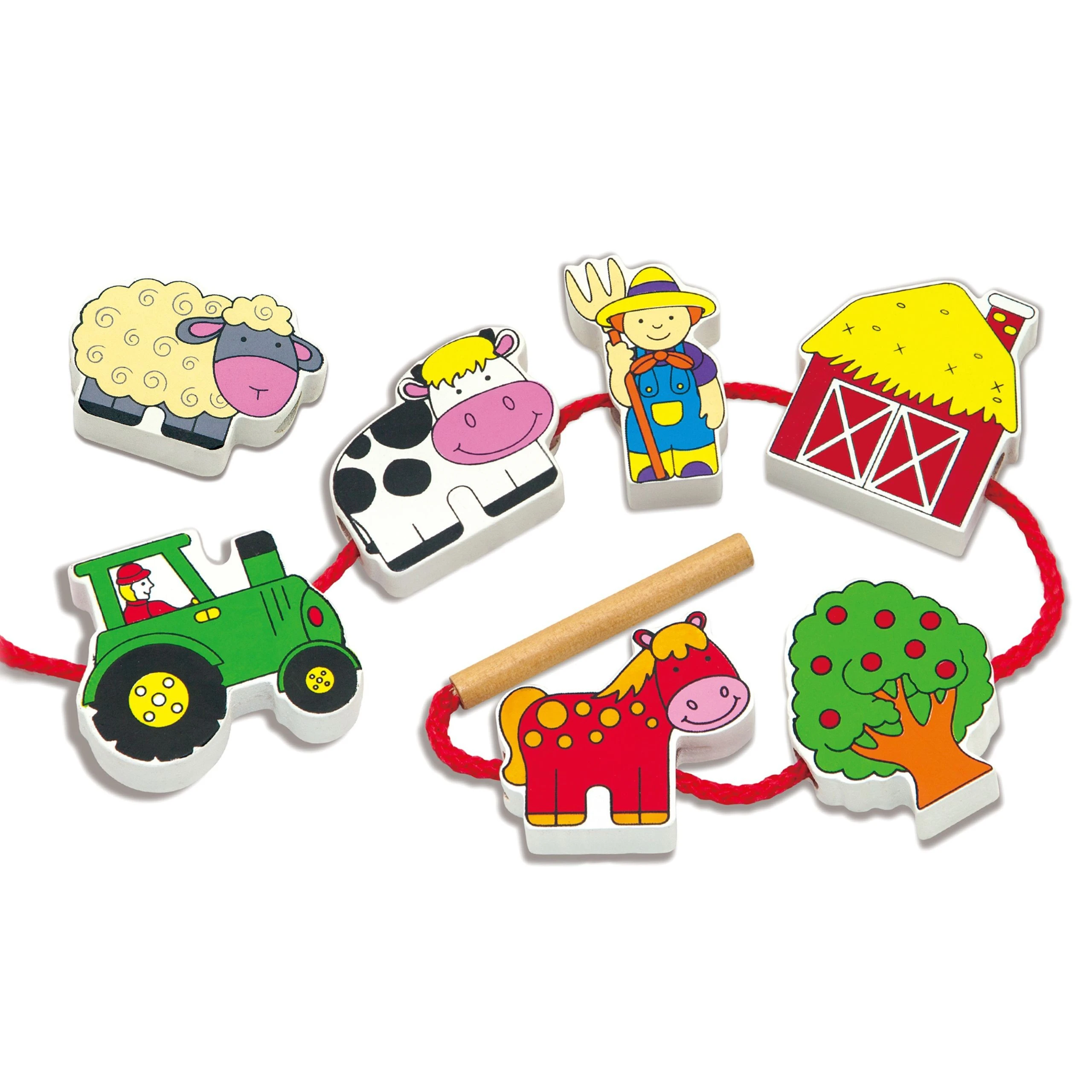 - - zestaw zawiera 12 drewnianych elementów do nawlekania (m.in. krówkę, konika, owieczkę, traktor, stodołę, drzewko oraz figurkę farmera),