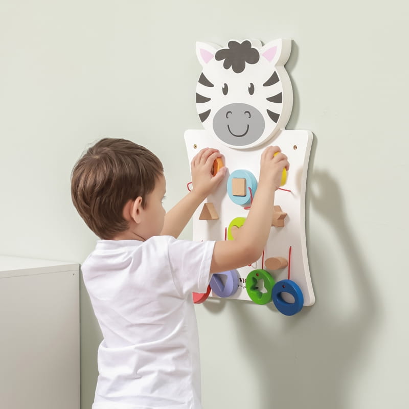 Drewniana Gra ścienna "Dopasuj kształty" Zebra od firmy Viga to jedna z czołowych zabawek, która pozwoli dziecku wejść do świata ciekawej i kreatywnej zabawy. Gra w formie sortera wyposażona jest w drewniane wypustki, na które należy umieścić odpowiedni kształt klocka na sznurku. Taka gra wprowadzi Twoje dziecko w ekscytującą zabawę i poprawi zdolność rozpoznawania kolorów i kształtów. To zalety, których nie zastąpi żadna inna zabawka. Kolorowa gra rozwija wyobraźnię i umiejętność logicznego myślenia.