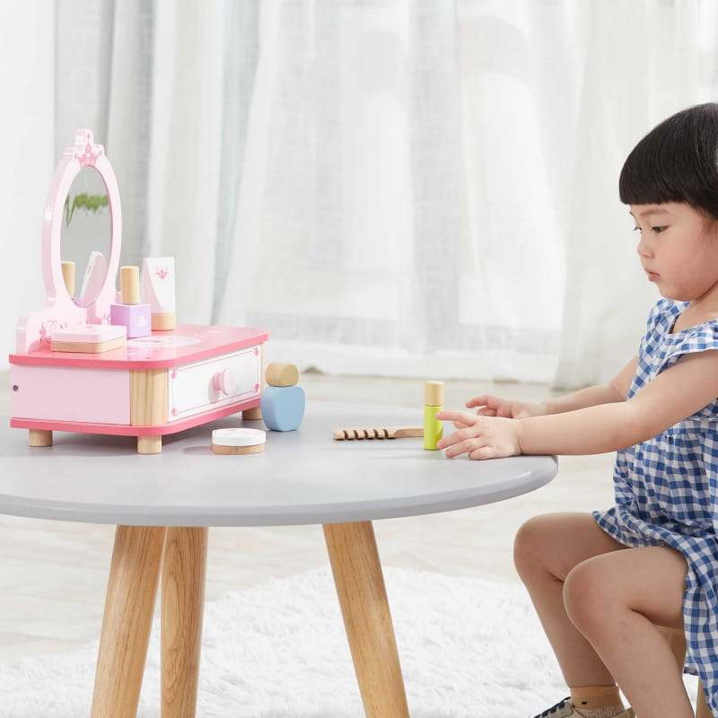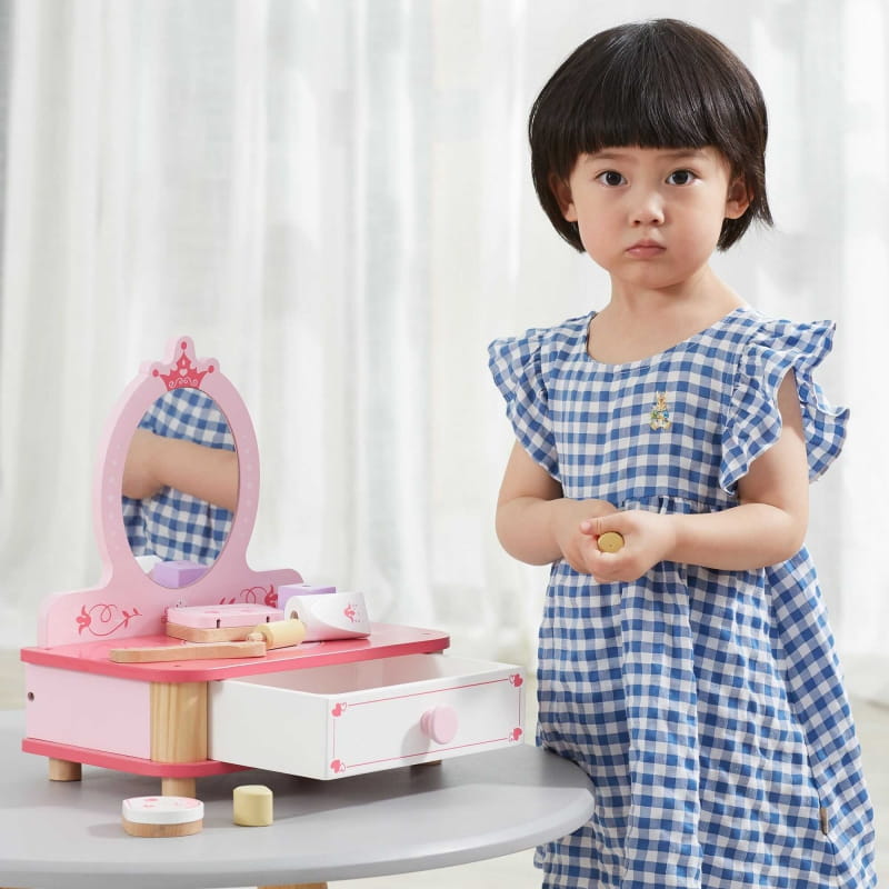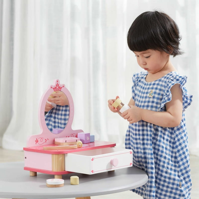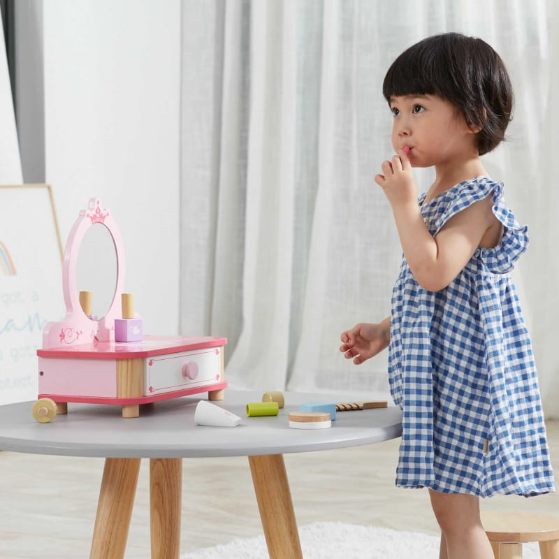Piękna różowa toaletka od Viga to wymarzony mebel w pokoju każdej dziewczynki. Toaletka posiada wysuwaną szufladę, w której mała księżniczka może schować swoje skarby. Do zestawu dołączone są jeszcze liczne akcesoria. Całość wykonana z drewna i pomalowana nietoksycznymi farbami bezpiecznymi dla dzieci i środowiska.