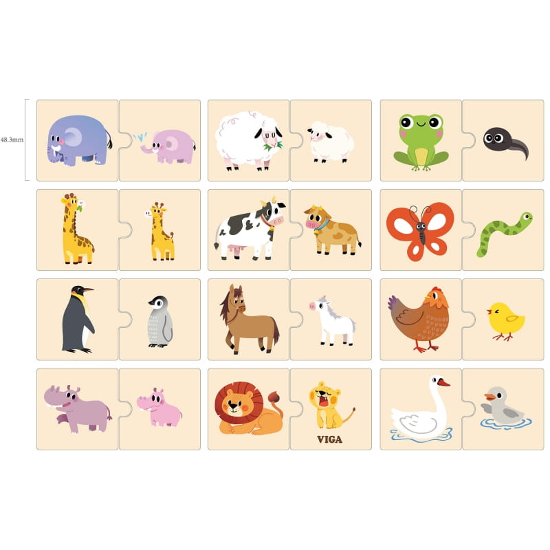 Drewniana Układanka od marki VIGA pozwoli na zabawę w dopasowanie 12 dorosłych zwierząt i ich maluchów. Dzięki zabawie dzieci rozwiną swoje słownictwo, koncentrację, zdolności motoryczne i logiczne myślenie poprzez dopasowanie i odkrywanie połączeń.