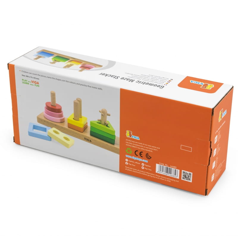 Drewniany Sorter Geometryczny marki Viga, to zabawka edukacyjna do nauki liczenia oraz rozróżniania kształtów i kolorów. Na każdym z czterech trzonków trzeba umieścić odpowiednie kształty, a utrudnienie z pozoru prostej zabawy polega na tym, że klocki trzeba dopasować do odpowiednich wypustek. Podczas zabawy dziecko rozwija zdolności manualne, koordynację ręka-oko oraz umiejętność logicznego myślenia. Żywe kolory przykuwają wzrok malucha i stymulują ten zmysł. Sorter został pozbawiony ostrych krawędzi, a zastosowanie nietoksycznych farb zapewnia bezpieczeństwo dla dzieci i środowiska.