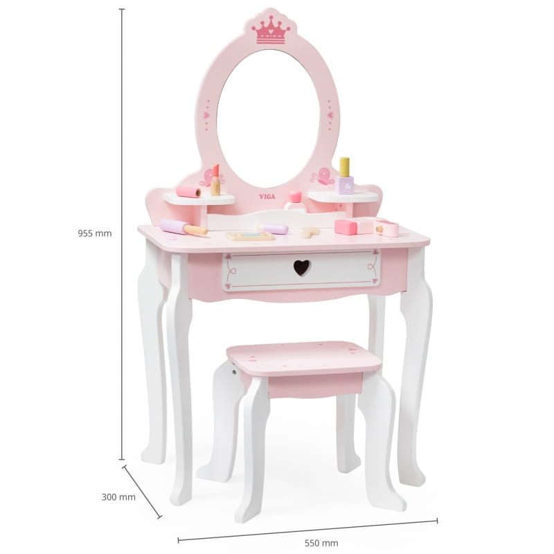 Duża Drewniana toaletka z marki Viga to wyjątkowa drewniana toaletka dla małej księżniczki, która spełni marzenia każdej dziewczynki! Wykonana z najwyższej jakości drewna, w delikatnych odcieniach różu i bieli, ta urocza toaletka zachwyca swoim bajkowym designem. Stylowe, zaokrąglone kształty, subtelne zdobienia i eleganckie nóżki sprawiają, że doskonale komponuje się w pokoju dziecięcym, dodając mu uroku i magii.Toaletka rozwija kreatywność, wyobraźnię i zachęca do odgrywania ról. Jest również doskonałym pomysłem na prezent – solidne wykonanie i estetyczny wygląd sprawią, że będzie służyć przez lata.