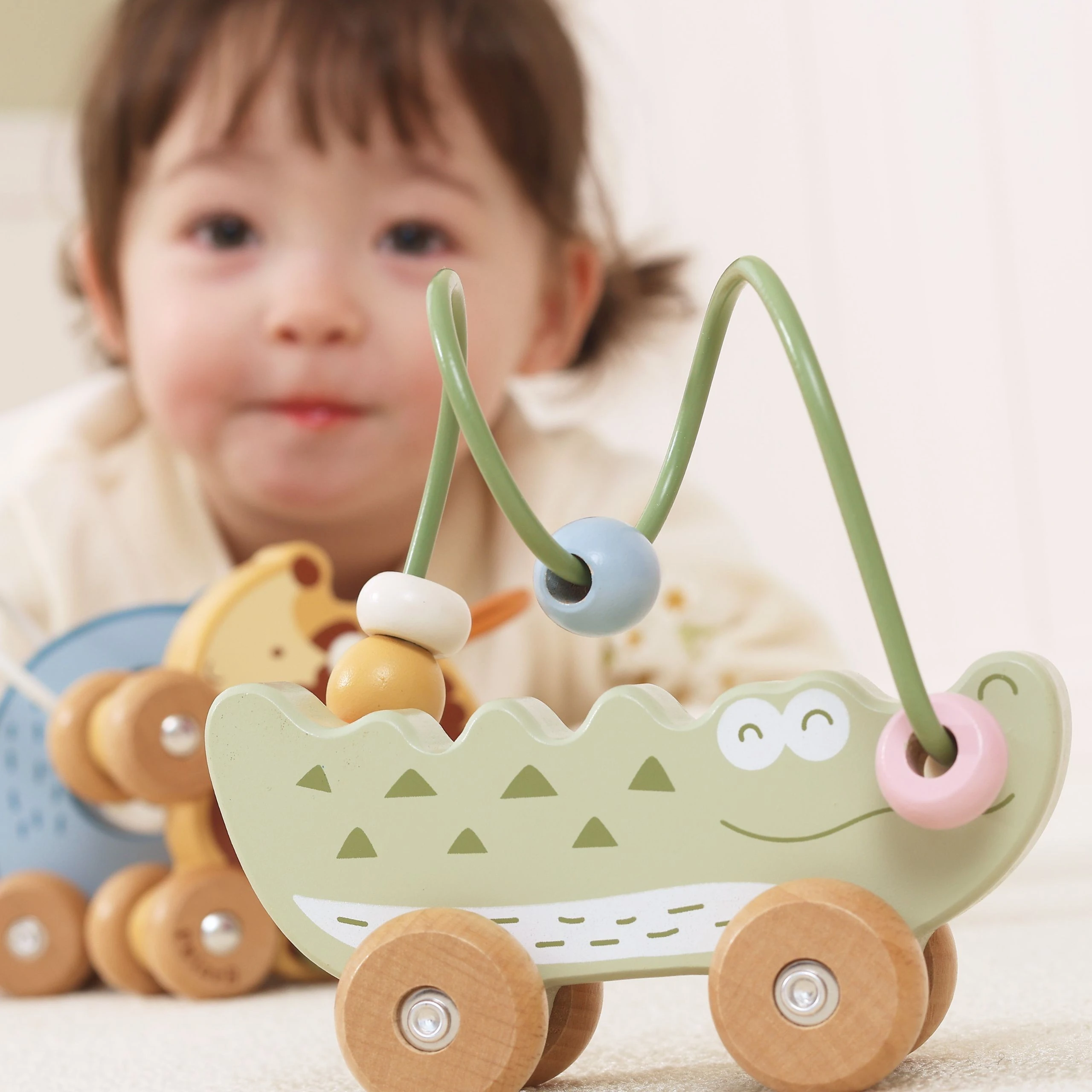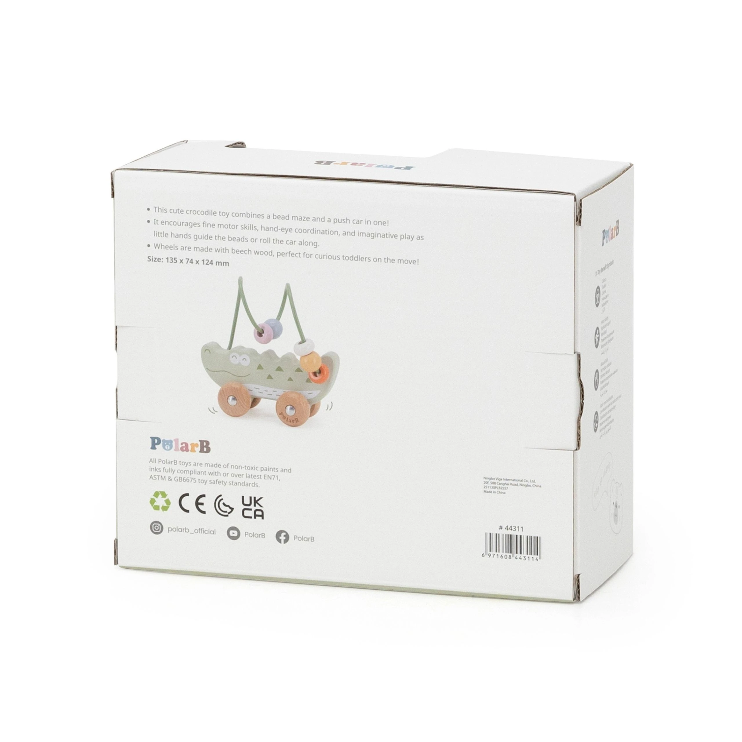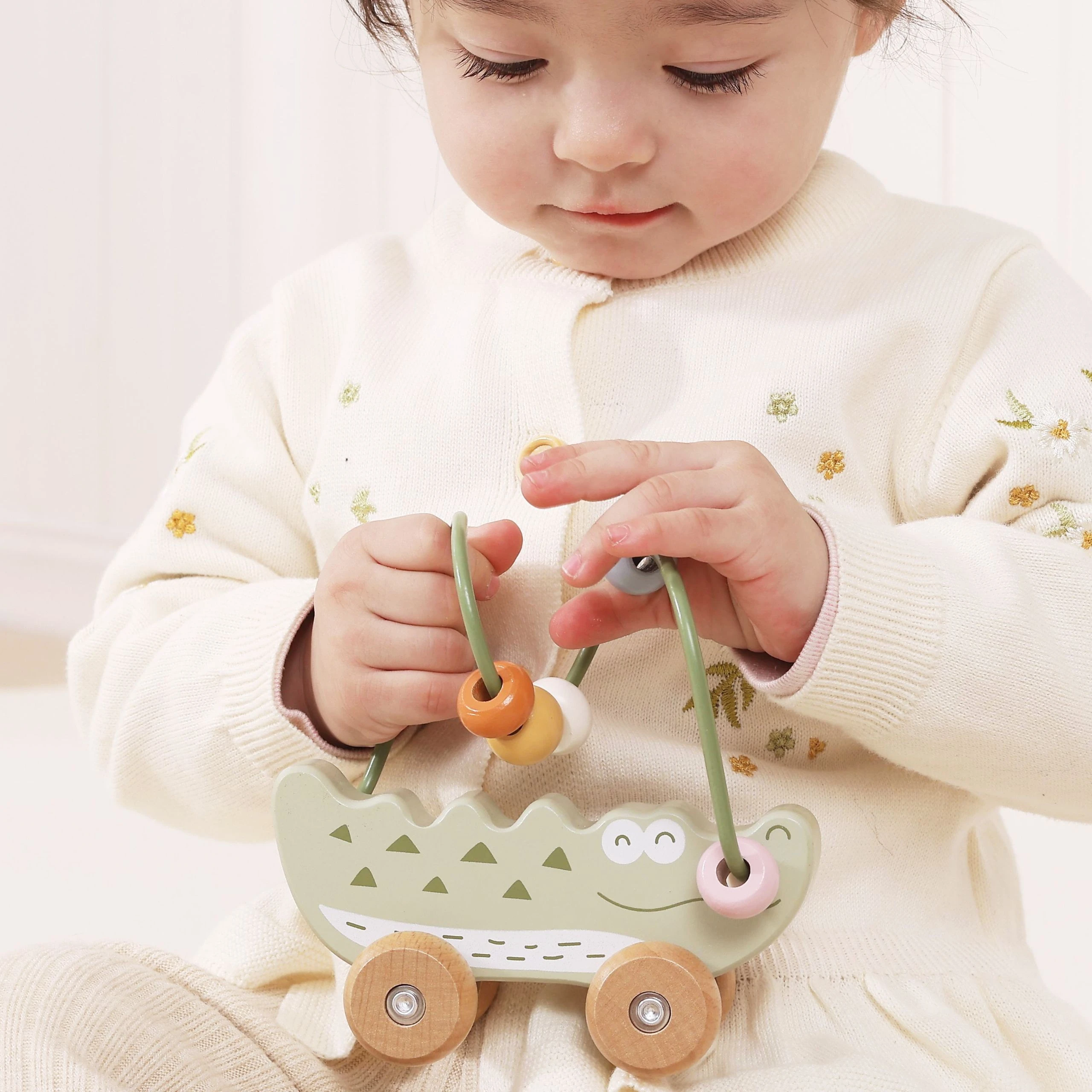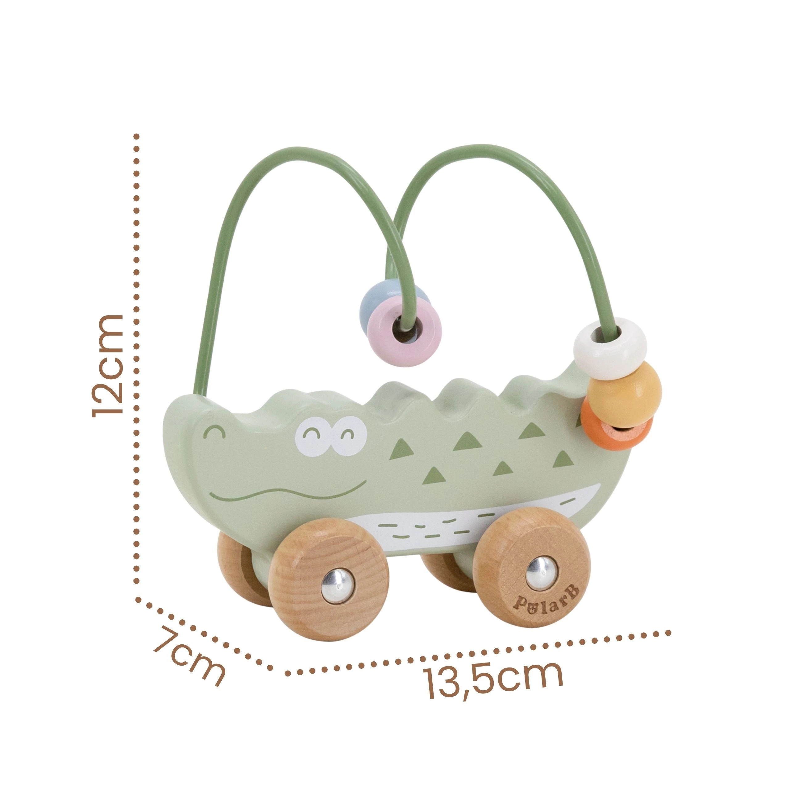 Uroczy labirynt koralikowy w kształcie Krokodyla to idealna pierwsza zabawka edukacyjna dla malucha już od 12. miesiąca życia. Łączy w sobie funkcję labiryntu z koralikami oraz jeździka do pchania, zapewniając podwójną radość z zabawy. Dziecko może przesuwać kolorowe koraliki po pałąku lub toczyć zabawkę po podłodze, rozwijając swoje umiejętności ruchowe. Naturalne drewno bukowe i zaokrąglone krawędzie gwarantują bezpieczeństwo podczas zabawy. To doskonały wybór dla rodziców szukających trwałej, estetycznej i edukacyjnej zabawki.