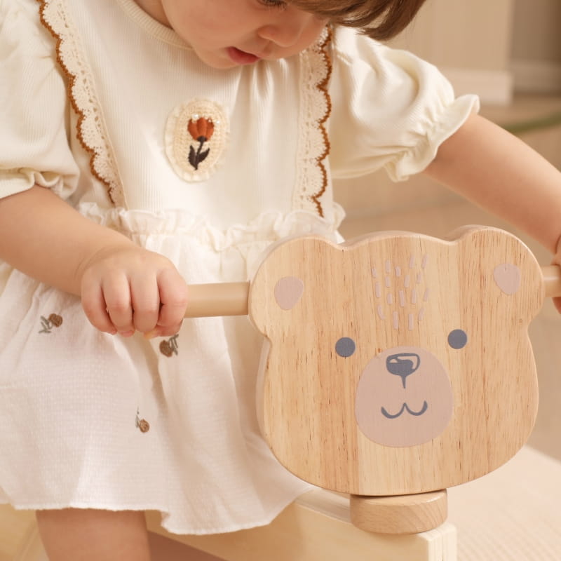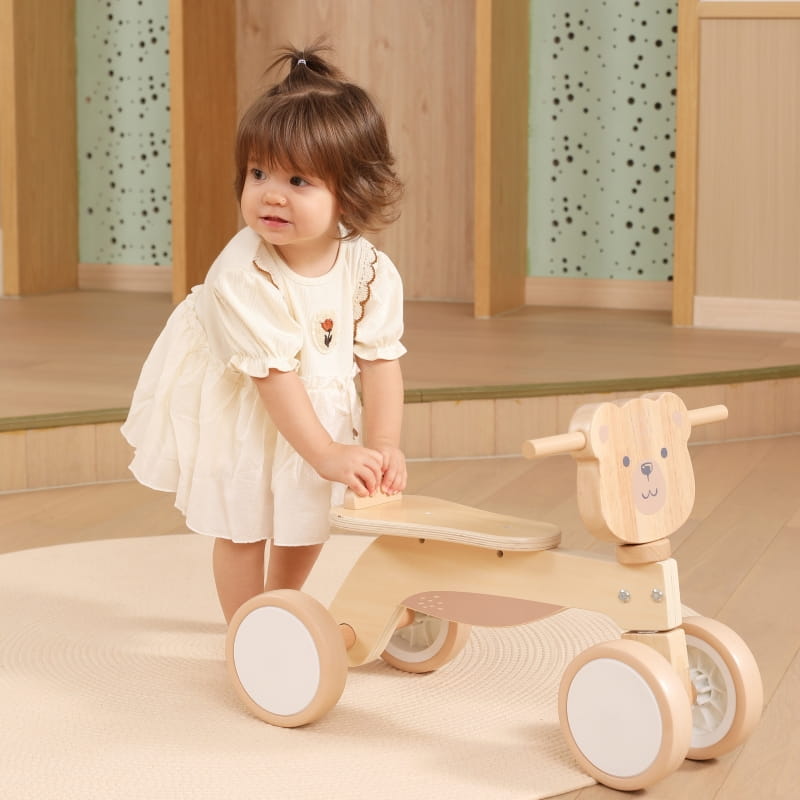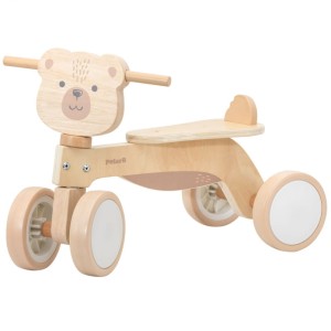 Drewniany jeździk trójkołowy z misiem brunatnym – bezpieczna i aktywna zabawa!