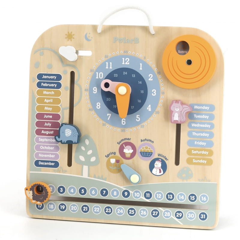 VIGA PolarB Drewniany Kalendarz i Zegar to wspaniałe połączenie zabawy z nauką. Zabawka pomoże nauczyć się dziecku korzystać z zegarka, nauczy poczucia czasu. Dzięki kolorowym obrazkom oraz figurkom możemy nauczyć naszą pociechę nazw dni tygodnia, miesięcy oraz pór roku w języku angielskim. To idealne połączenie przyjemnej zabawy z pożyteczną nauką. Cała seria zabawek POLAR BEAR została stworzona przez firmę VIGA aby sprostać oczekiwaniom rodziców i dzieci w doskonaleniu procesu ich rozwoju poprzez zabawę.