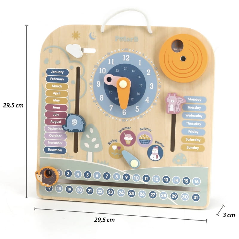 - - drewniana zabawka z zegarem i oznaczeniami: dni tygodnia, miesięcy, pór roku oraz pogody,