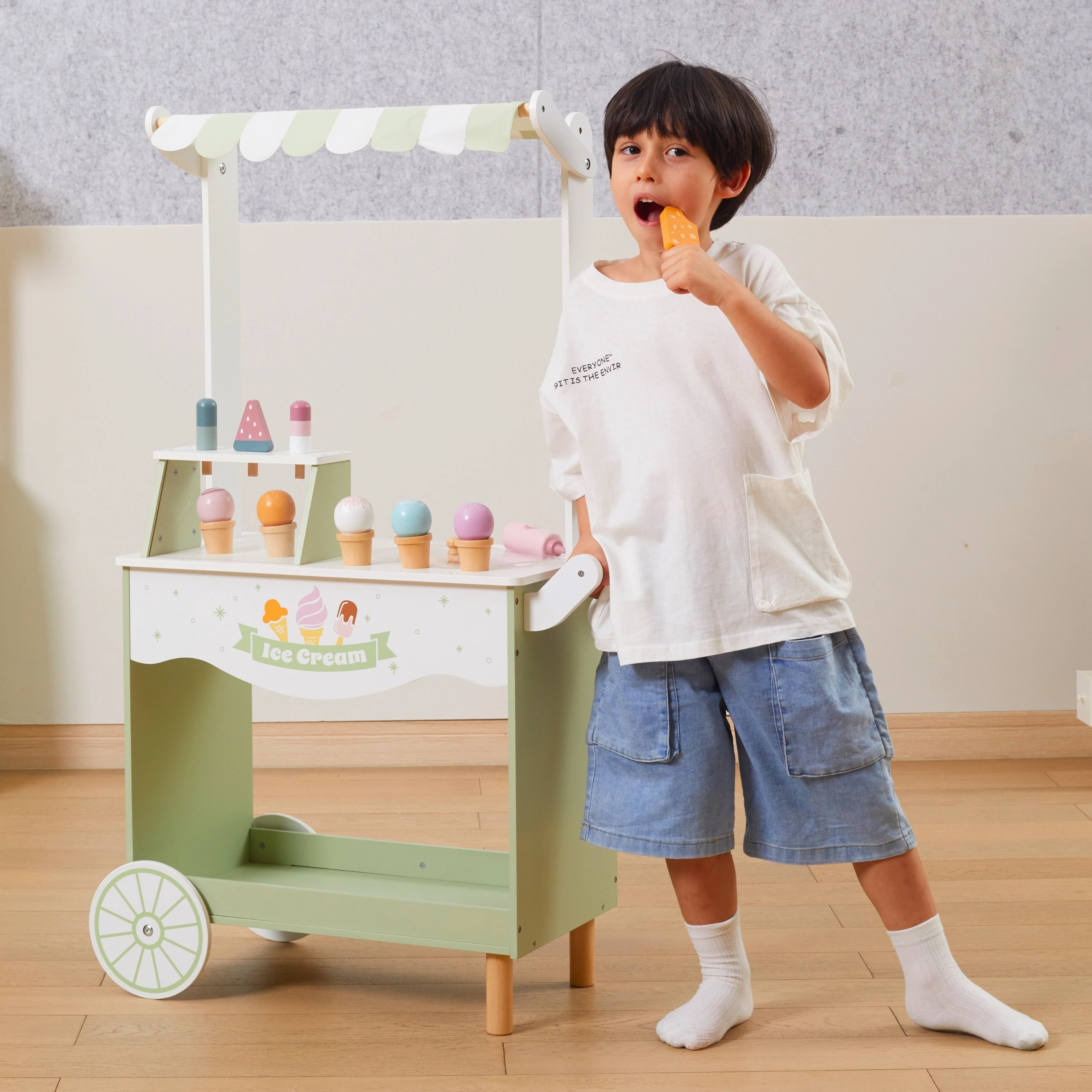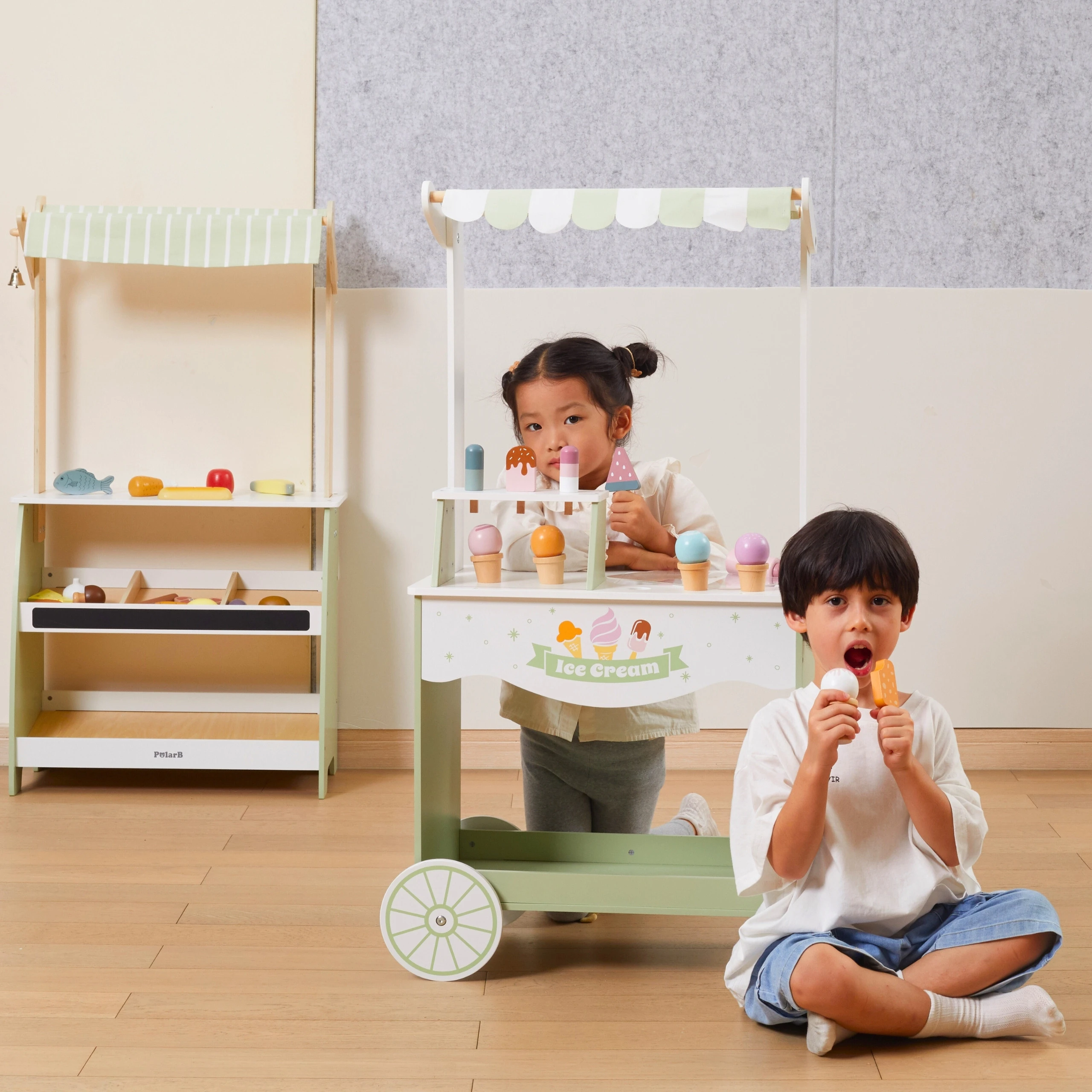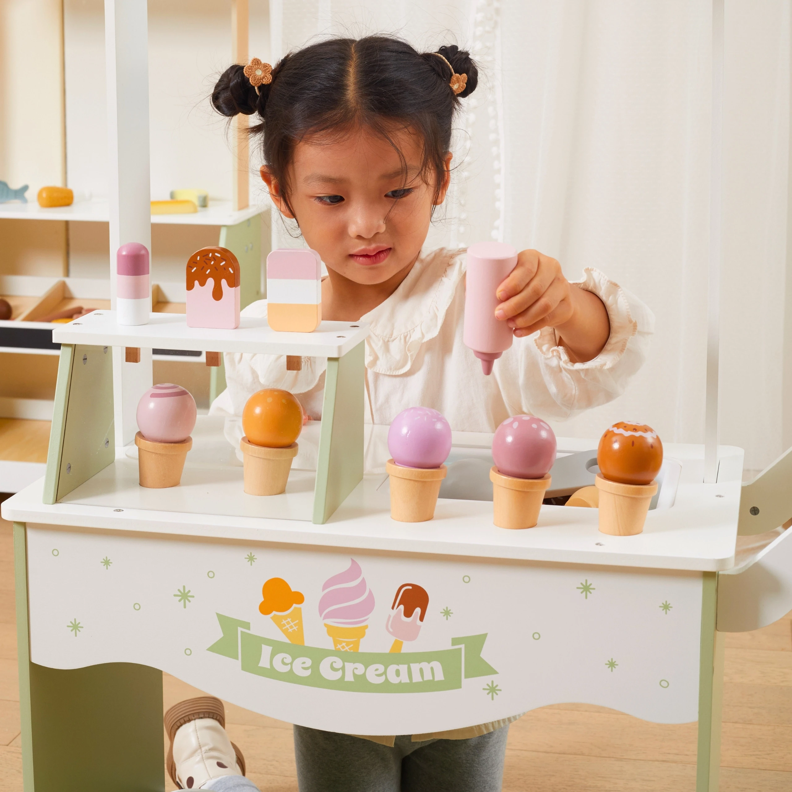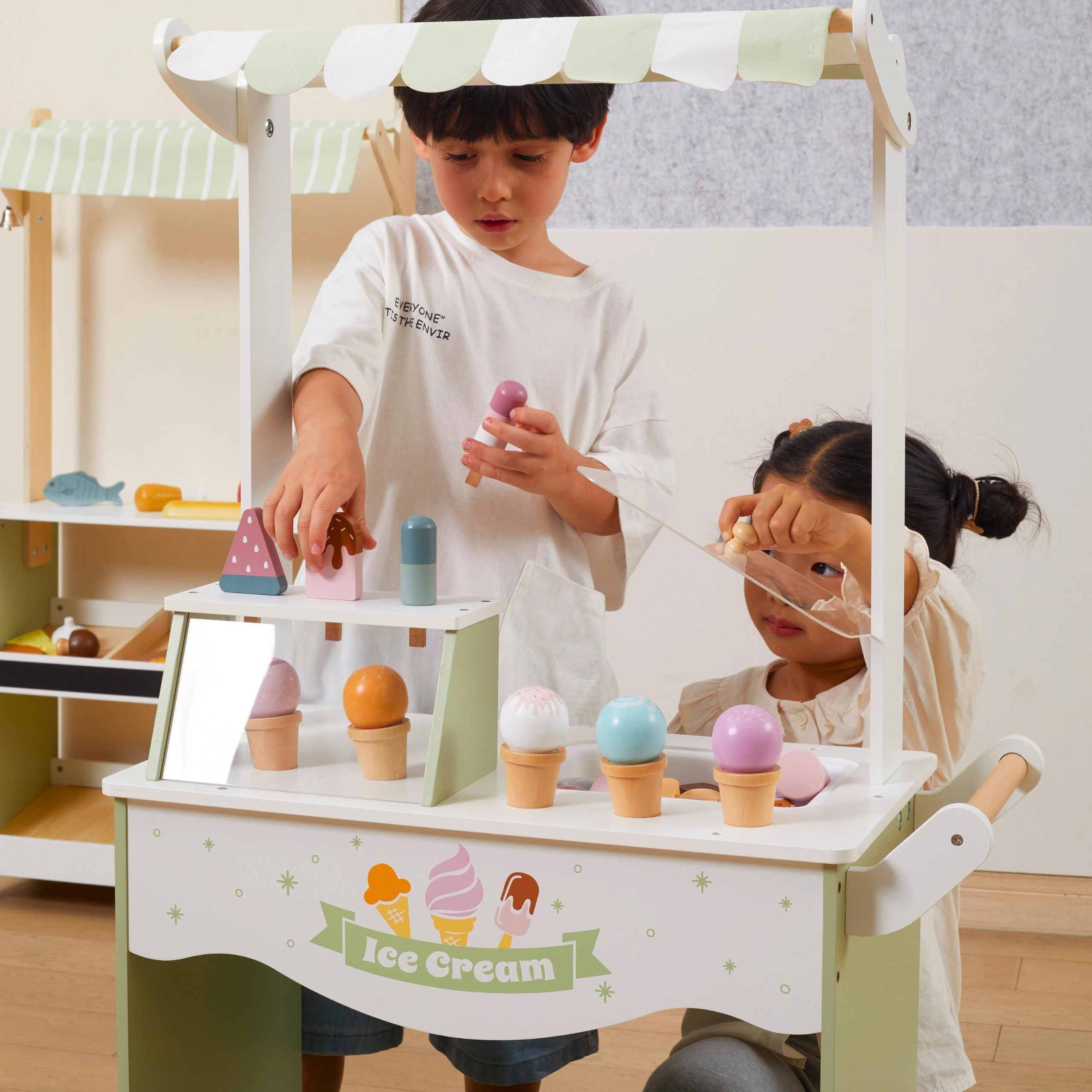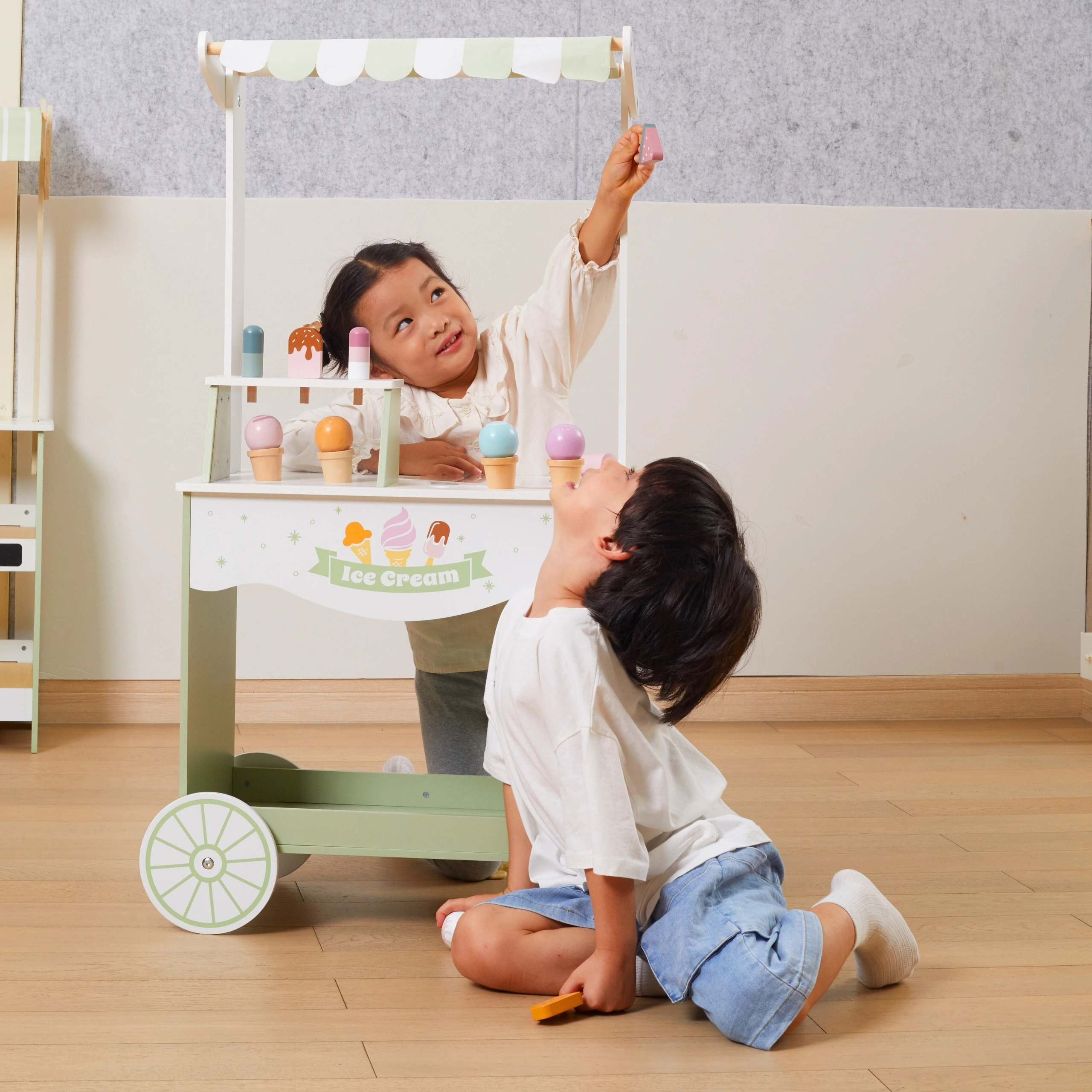 Duży Drewniany Stragan z Lodami od marki Viga jest wyposażony w pięknie zrobione lody, rożki, lody na patyku, a nawet w magnetyczną łyżkę do nakładania lodów dla jeszcze bardziej realistycznej zabawy w małego sprzedawcę lodów. Gałki z lodami mogą być dowolnie nakładane przy użyciu magnetycznej łyżki. Na bocznej ściance znajdziemy tablicę kredową, na której można zapisać menu. Na dole wózka znajdziemy półeczkę do przechowywania. Dołączone kółka ułatwiają przemieszczanie z miejsca na miejsce. Dzięki temu zestawowi dzieci mogą poprzez zabawę rozwijać swoją wyobraźnię, umiejętności społeczne i językowe.