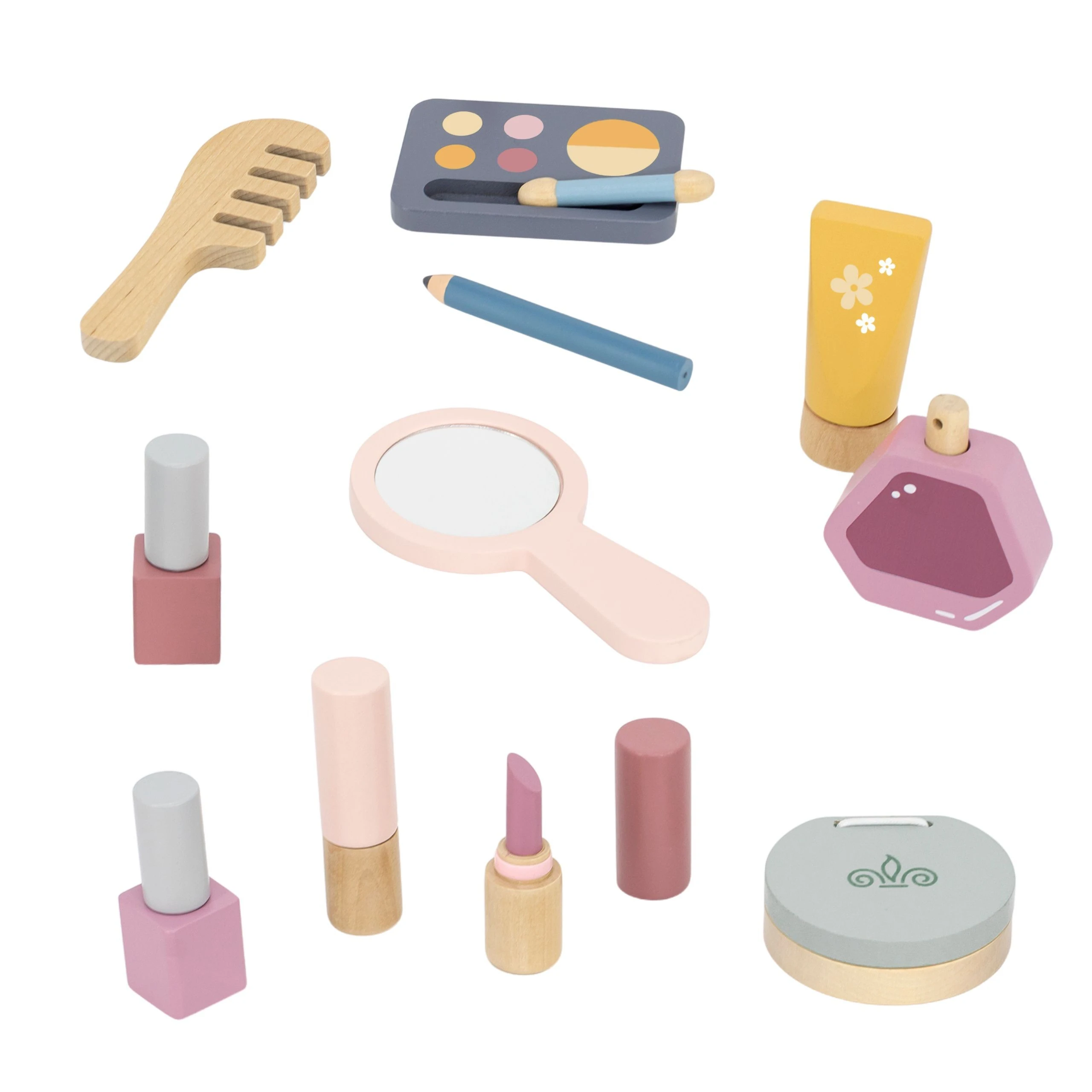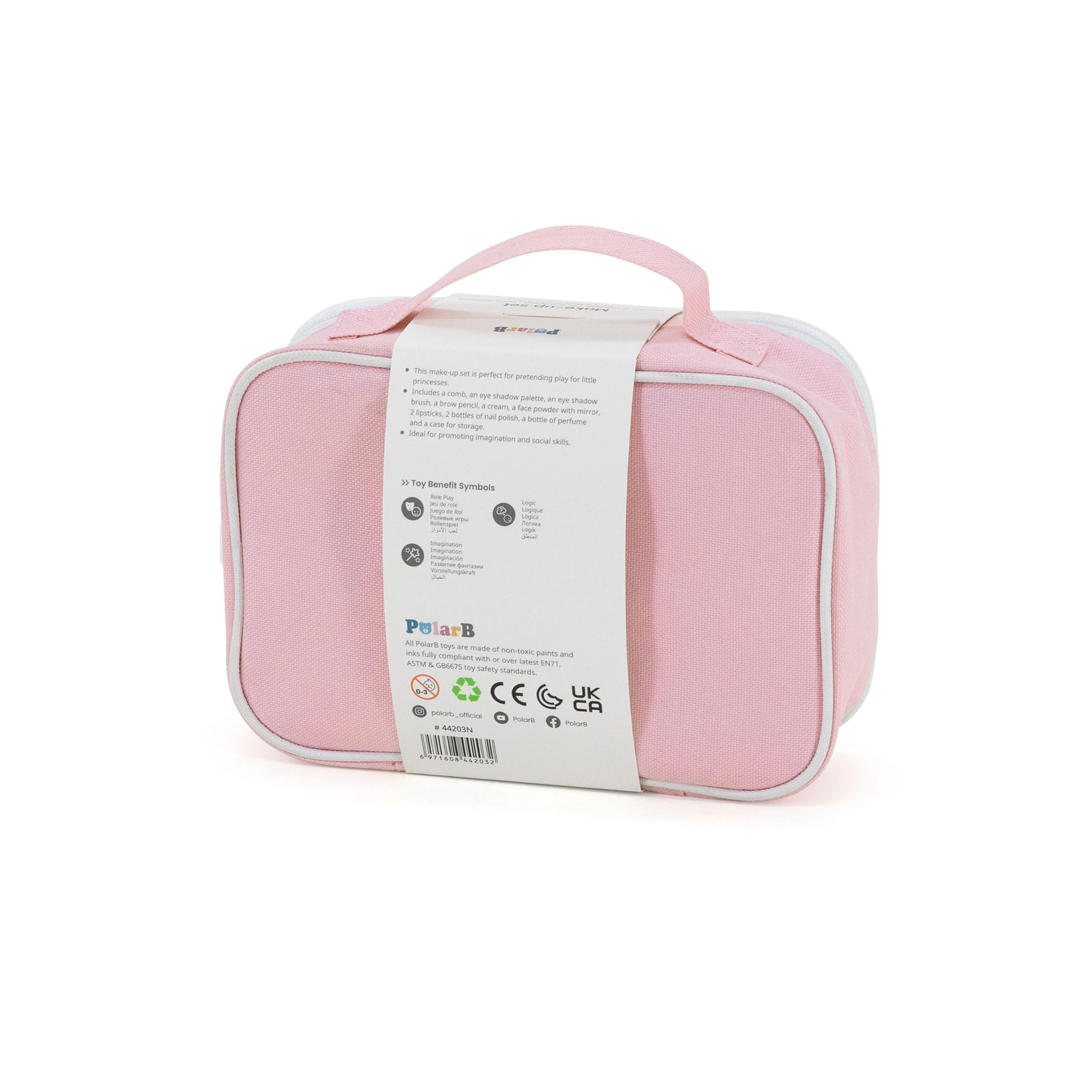 Drewniany Zestaw do Makijażu w przenośnej kosmetyczce od firmy Viga zawiera wszystko, co potrzebuje mała wizażystka w salonie piękności. Zabawka rozwija kreatywność i precyzję ruchów. W skład zestawu wchodzą drewniane elementy takie jak okrągłe bezpieczne lusterko, paletkę cieni z aplikatorem, puderniczkę z lusterkiem, 2 lakiery do paznokci, 2 szminki, flakonik perfum, grzebień, tubkę i torbę do ich przechowywania, która pozwala na trzymanie zestawu zawsze pod ręką. Produkt wykonany z myślą o małych rączkach dziecka. Solidne i precyzyjne wykonanie bez ostrych krawędzi sprawia, że jest w 100% bezpieczny dla naszej pociechy. Zabawka zadowoli każdą małą księżniczkę i pozwoli na stworzenie swojego kącika piękności.