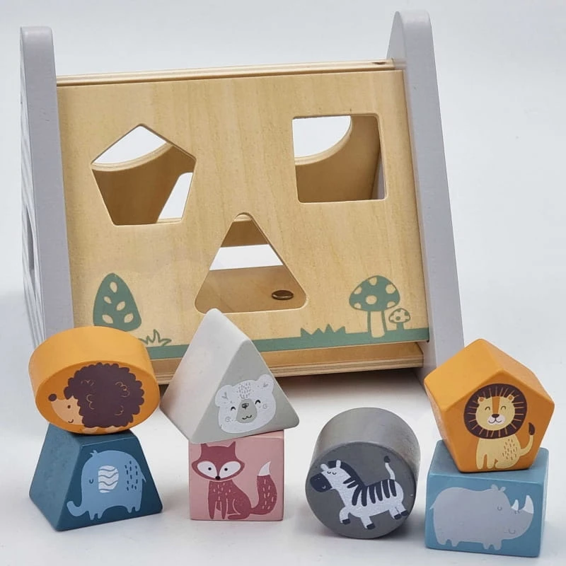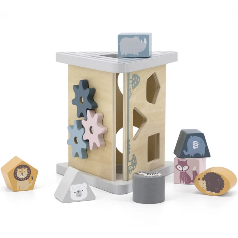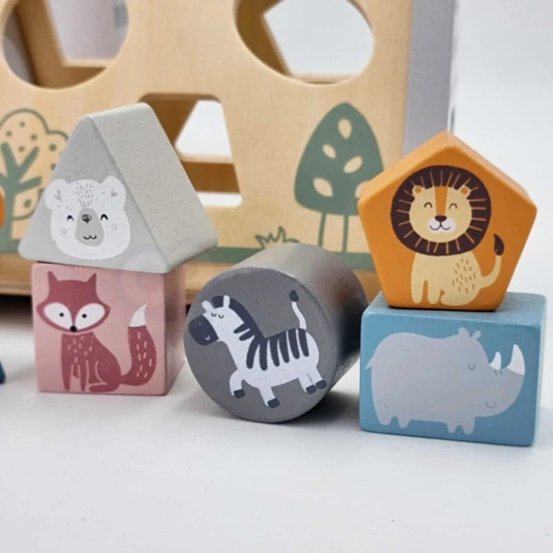 - - zadaniem dziecka jest dopasowywanie kształtów klocków, na których umieszczone zostały kolorowe postaci zwierząt i wciśnięcie w odpowiedni otwór, aby przeszły na drugą stronę pięciu drewnianych boków układanki w kształcie piramidki pokrytej rysunkami,