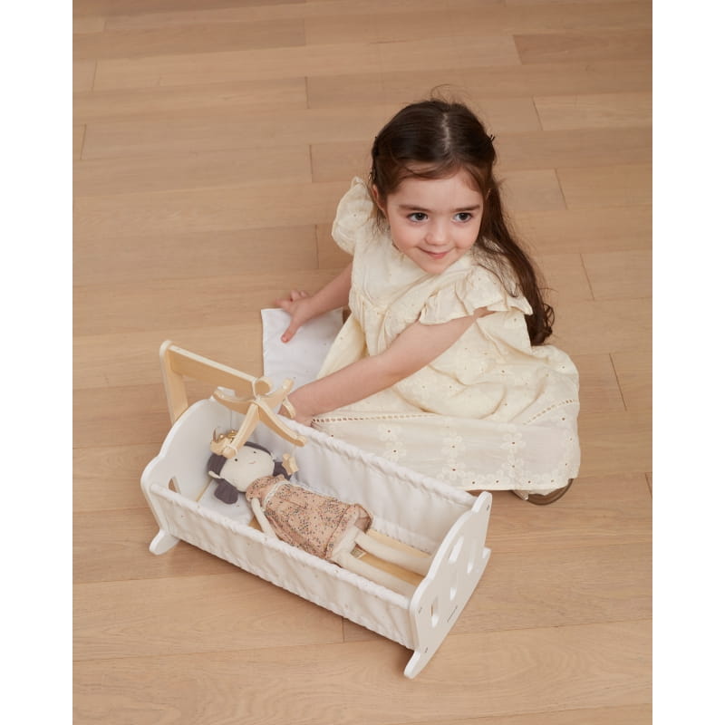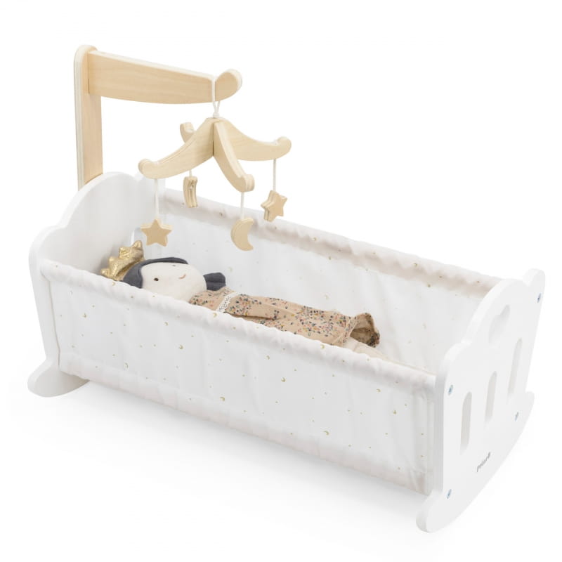 Połóż swoją lalkę do snu w pięknie wykonanej kołysce z serii PolarB marki VIGA. Kołyska posiada miękką bawełnianą poduszkę i kołderkę ze słodkim nadrukiem gwiazd i księżyca oraz uroczą karuzelę do łóżeczka. Pasuje do lalek o wysokości do 38 cm.