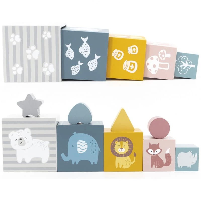 - - zestaw składa się z 5 pudełek o różnych rozmiarach oraz 4 klocków o różnych kształtach geometrycznych,