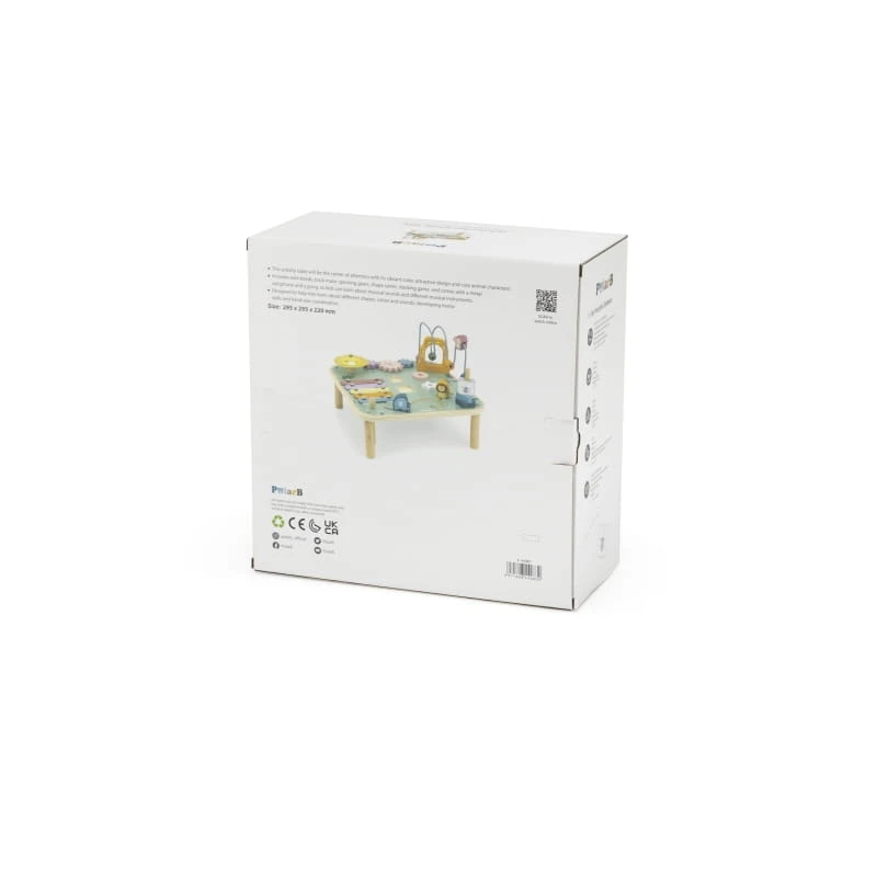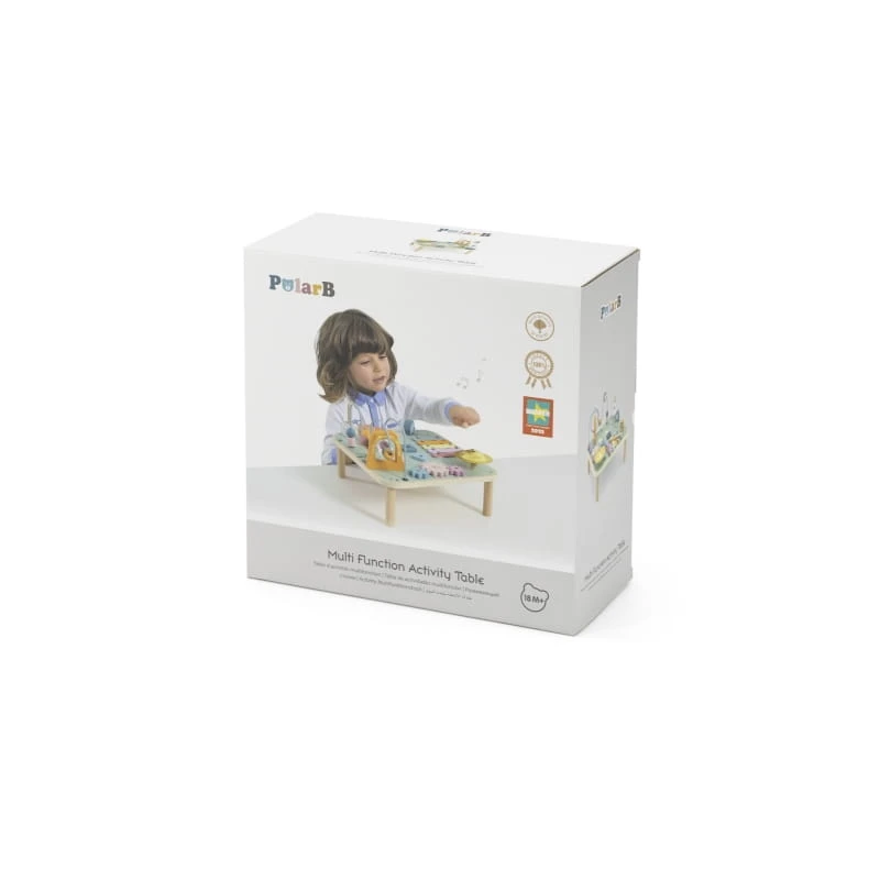 Drewniany stolik edukacyjny od firmy Viga to jedna z czołowych zabawek, która będzie służyła długo i zapewni Twojemu dziecku wiele lat ciekawej i kreatywnej zabawy. Stolik jest wystarczająco duży, aby kilkoro dzieci mogło bawić się jednocześnie. Kolorowy stół edukacyjny cieszy oko i zachęca do zabawy. Na stole zamontowane są pętle motoryczne, ksylofon, gong, sorter kształtów, przesuwak oraz koła zębate.