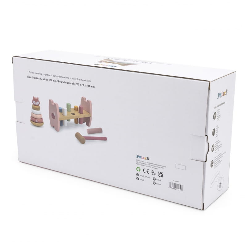W tym zestawie z serii PolarB od marki Viga znajdziemy dwie pastelowe, drewniane zabawki: piramidkę edukacyjną oraz przebijak z młoteczkiem. Obie zabawki nie tylko wypełnią czas dziecka świetną zabawą, ale przyczynią się do rozwoju zdolności motorycznych, logicznego myślenia oraz nauki kolorów. Dzięki spędzaniu czasu z tymi zabawkami dziecko nabędzie precyzję ruchów rączek, która w przyszłości ułatwi naukę pisania.