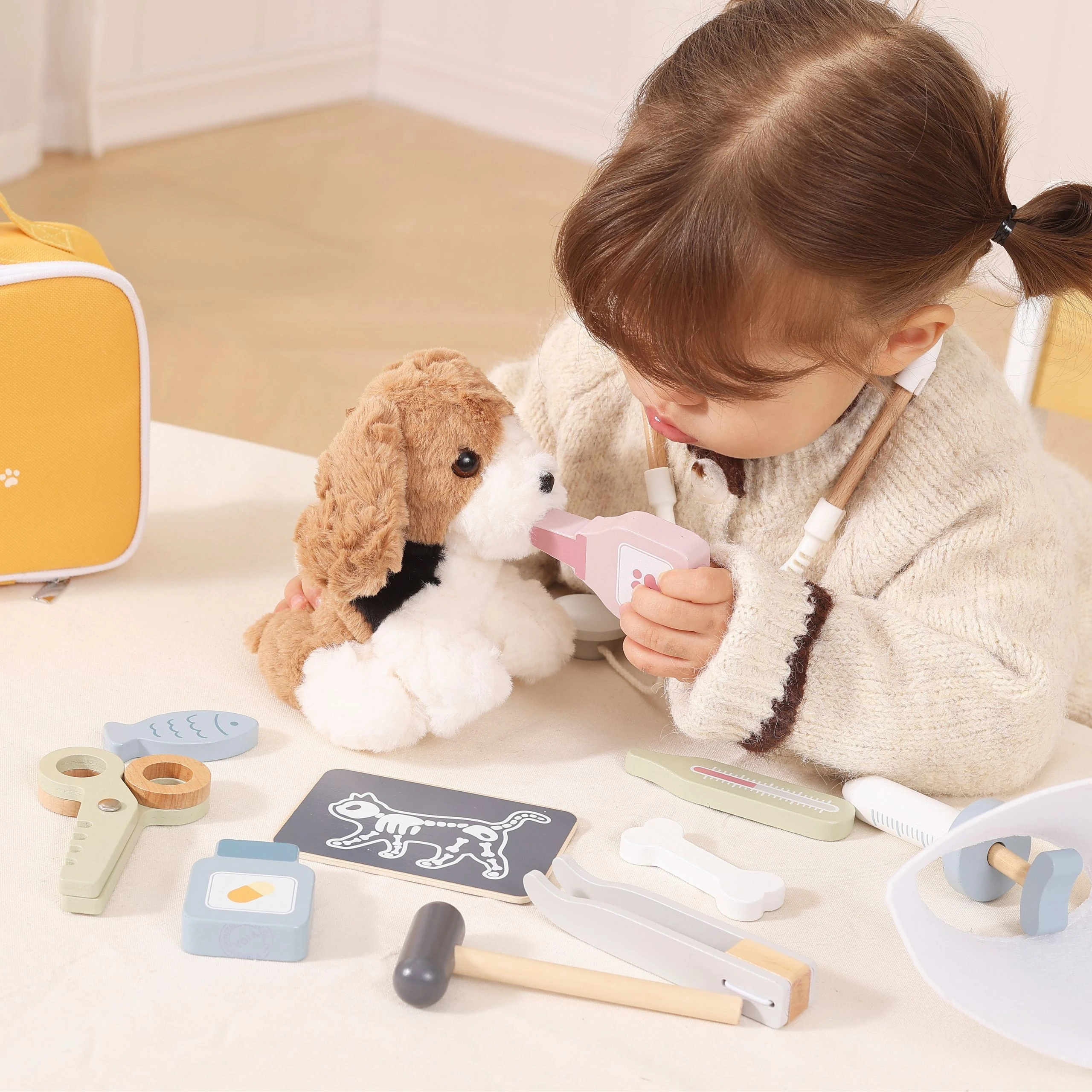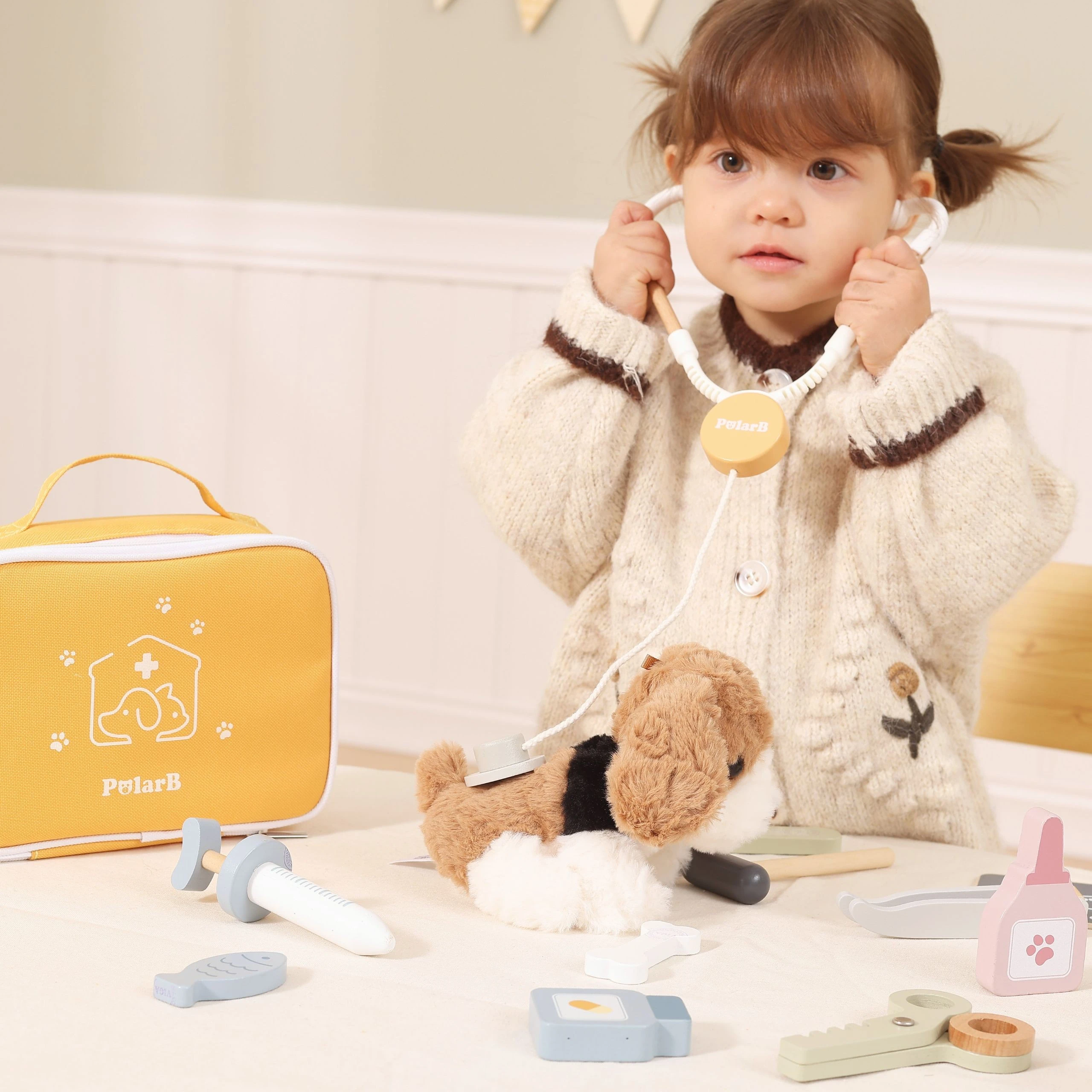 Zestaw do pielęgnacji zwierząt VIGA PolarB przenosi dziecko w świat prawdziwej kliniki weterynaryjnej, gdzie może troszczyć się o swoich pluszowych pacjentów. Dzięki 12 realistycznym akcesoriom każdy mały miłośnik czworonogów poczuje się jak profesjonalny lekarz weterynarii. To doskonała zabawa w odgrywanie ról, która uczy empatii, odpowiedzialności i troski o innych.Całość została zapakowana w elegancką, żółtą torbę z wygodną rączką oraz zamkiem błyskawicznym. Ułatwia ona przechowywanie wszystkich elementów i pozwala zabrać zestaw w podróż, do przedszkola czy do dziadków. Porządek i mobilność w jednym!
