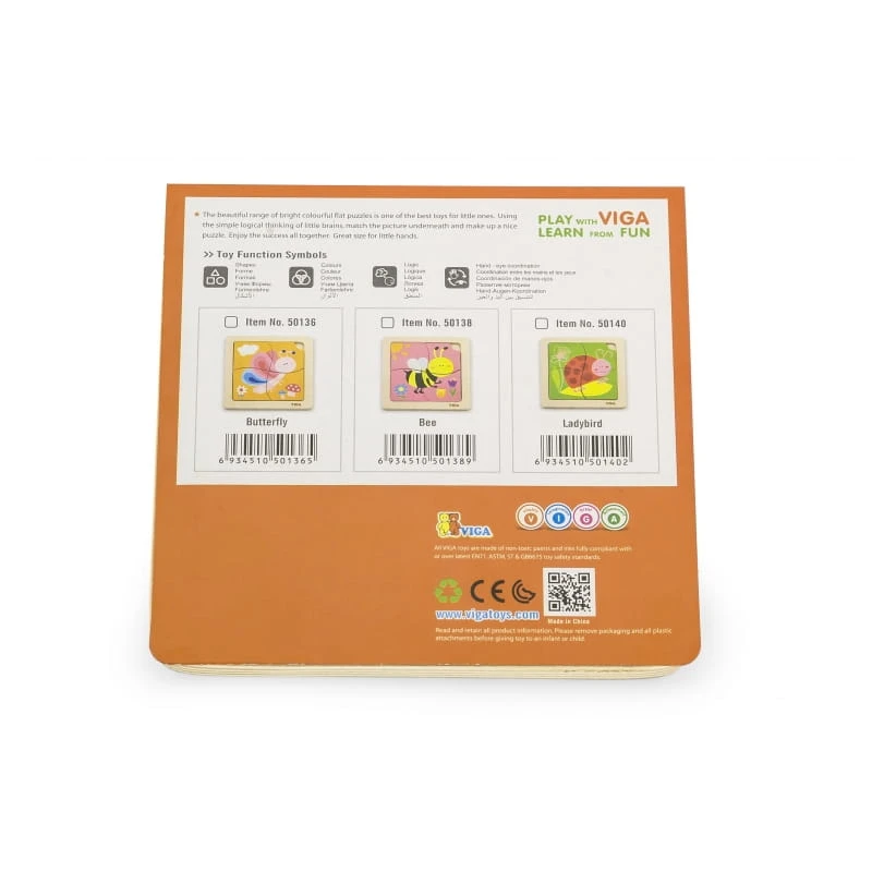 Drewniane Puzzle od Viga dla dzieci od 12 miesiąca życia to idealne rozwiązanie do domu, jak i do przedszkola. Składa się z planszy, oraz 4 elementów tematycznych, które należy do niej zamontować. Na drewnianej podstawce znajduje się narysowany gotowy obrazek, dzięki czemu dziecku jest łatwiej dopasować obrazek. Całość wykonana została z drewna i pomalowana bezpiecznymi dla dziecka farbami w żywe barwy, które zadowolą każdego użytkownika i dadzą mnóstwo radości z zabawy.