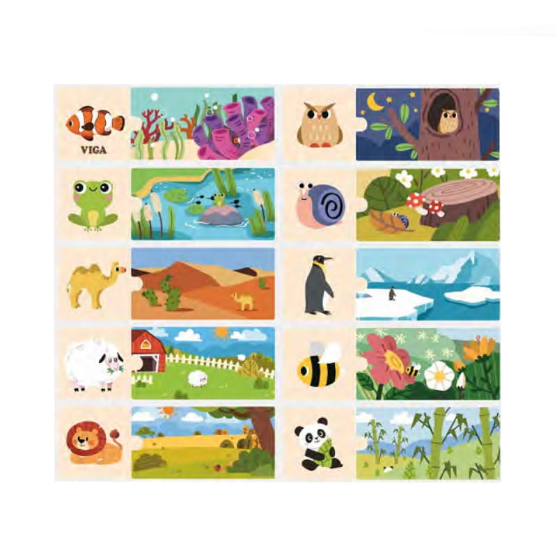 Logiczne puzzle od marki VIGA - zabawa polega na połączeniu puzzli pasujących do siebie. Zestaw składa się z 20 elementów, które trzeba ze sobą połączyć w taki sposób aby dane zwierzątko było przyporządkowane do swojego naturalnego miejsca bytowania. Elementy są bardzo dobrze dopasowane, oraz posiadają kolorowe obrazki.
