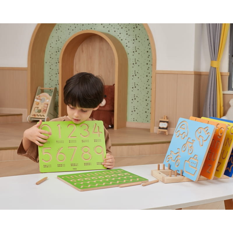 Tablica kreślarska od marki VIGA to idealna propozycja dla dzieci do trenowania rączki przed nauką pisania. Delikatnie wygrawerowane i zakrzywione rowki sprawiają, że idealnie nadaje się dla dzieci do kontrolowania ruchu dłoni i kształtowania pamięci mięśniowej poprzez wielokrotne śledzenie. Każda litera jest oznaczona strzałkami, co pomaga dzieciom w prawidłowej kolejności pisania. Tablica jest dostępna w kompaktowych rozmiarach, dzięki czemu dzieci mogą ją trzymać i używać na stole lub biurku.Dziecko poprzez zabawę uczy się ruchów odpowiedzialnych w przyszłości za rysowanie i pisanie, kształci płynność ruchów oraz ćwiczy koordynację wzrokowo - ruchową.
