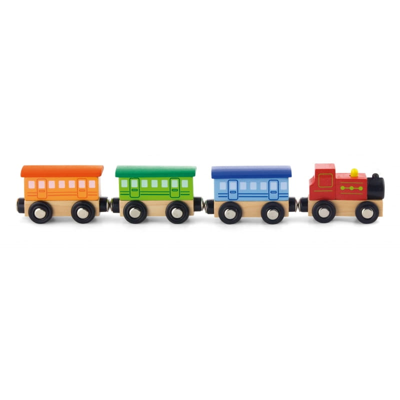 Zestaw od firmy Viga składający się z 4 elementów połączonych magnesami tworzących pociąg. Komplet może być wykorzystywany jako samodzielna zabawka, może też służyć jako uzupełnienie kolejki, innych zestawów, czy klocków.