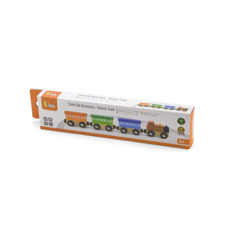 Drewniana figurka przedstawiająca klasyczny pociąg składa się z 4 elementów. Zaprojektowany została przez cenionego producenta zabawek drewnianych firmę Viga Toys dla dzieci od 3 roku życia.