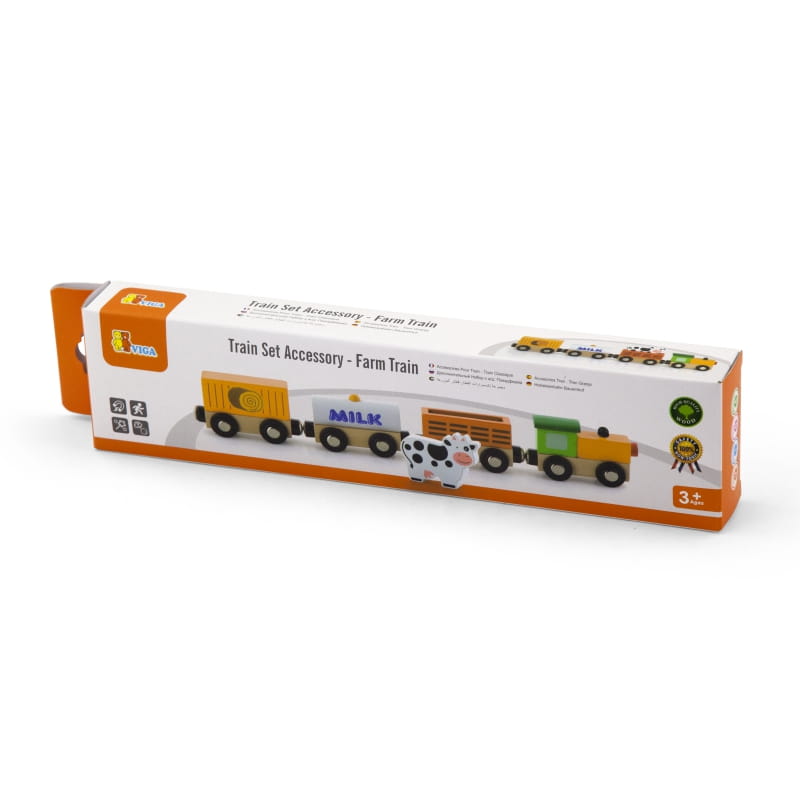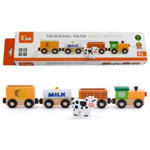 Drewniana figurka pociągu z wagonami wypełnionymi ładunkiem związanymi z farmą. Składa się z 4 elementów, które łączą się ze sobą magnesami. Zaprojektowana została przez cenionego producenta zabawek drewnianych firmę Viga Toys dla dzieci od 3 roku życia, doskonała do przedszkola jak i do domu.