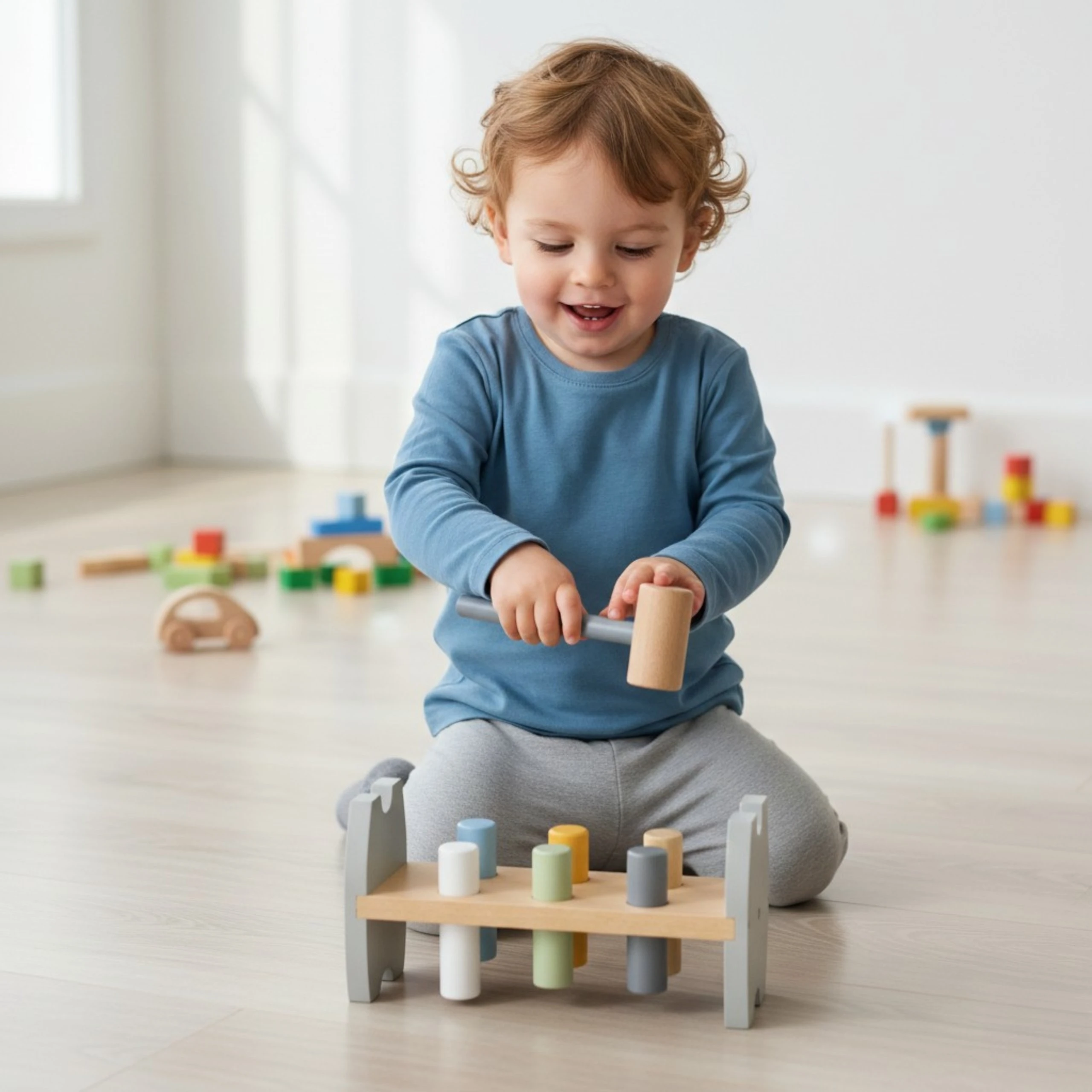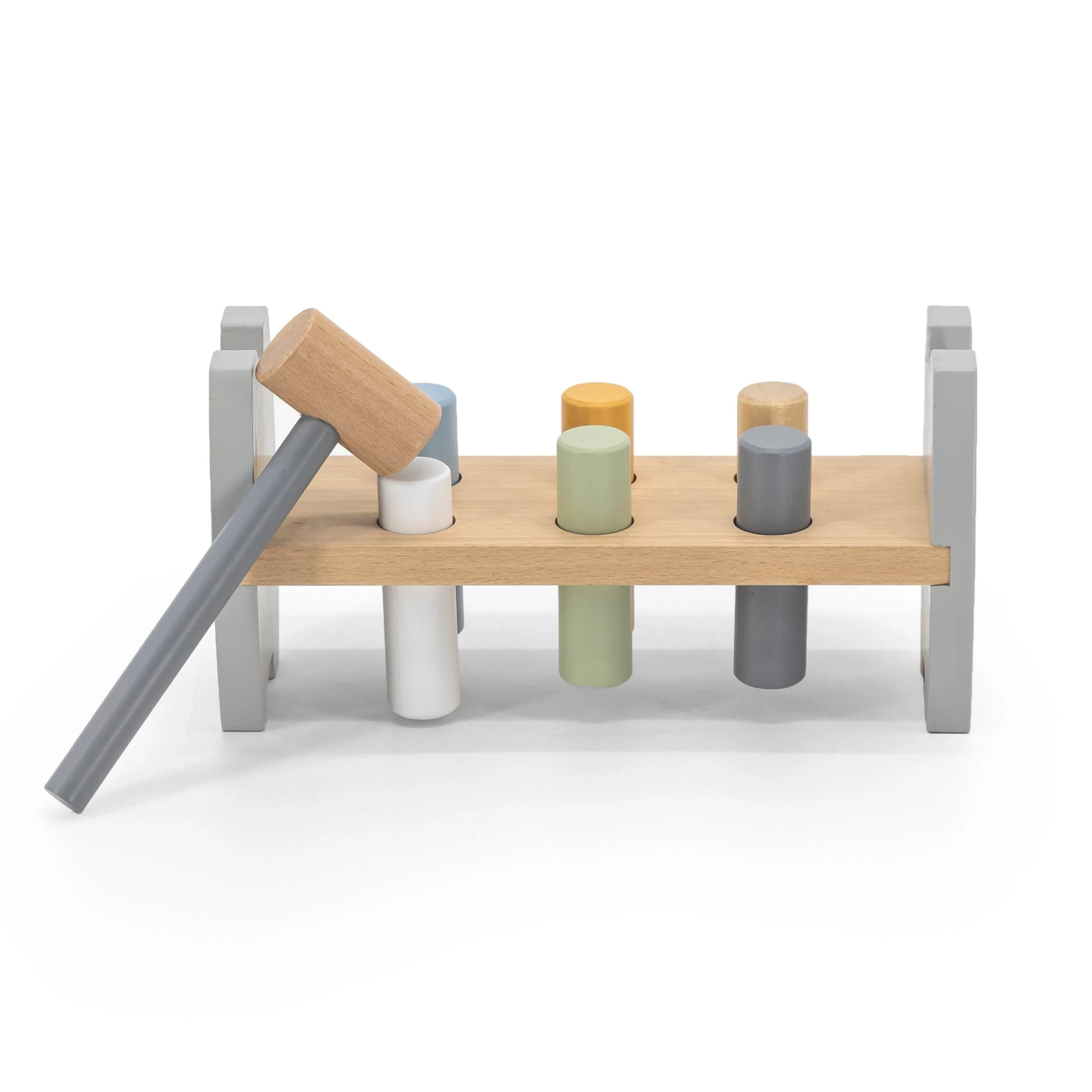 - - Zestaw zawiera podstawkę, 6 kolorowych kołków, młoteczek do wbijania