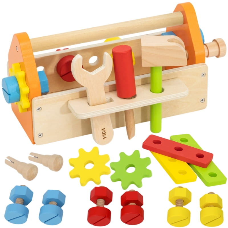 Drewniana Skrzynka z Narzędziami marki Viga z kolekcji PolarB zapewni wspaniałą zabawę każdemu małemu majsterkowiczowi. Zestaw zawiera młotek, klucz, śrubokręt, 4 pary śrub i nakrętek, kołek, 2 koła zębate i 2 panele z otworami. Dzieci mogą poznawać różne narzędzia i rozwijać umiejętności obracania, uderzania i dopasowywania. Zabawa w majsterkowanie wspomoże rozwój zdolności manualnych, zaciekawi i pobudzi wyobraźnię dziecka.
