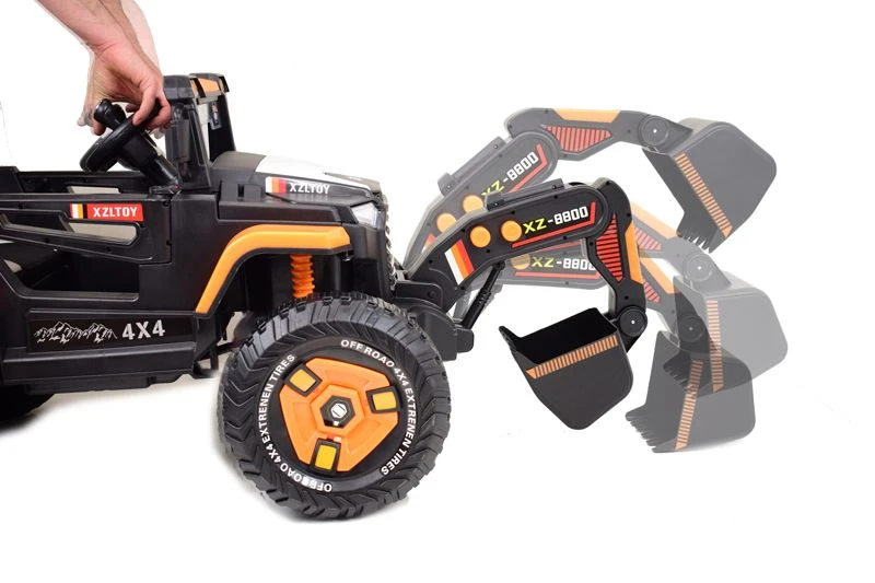 KOPARKA NA AKUMULATOR z ruchomą elektryczną łyżką - możliwość jazdy pojazdem za pomocą silnika napędowego oraz sterowania łyżką/góra dół+ dalej/bliżej. Dodatkową atrakcją są wgrane w pamięć piosenki. Panel z wejściem USB, AUX, klaskon.